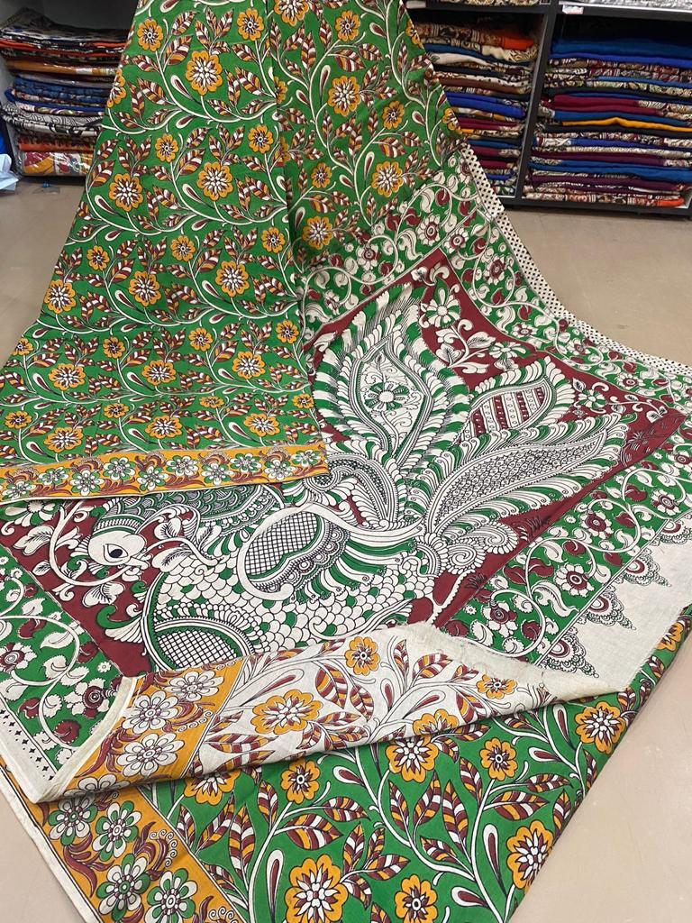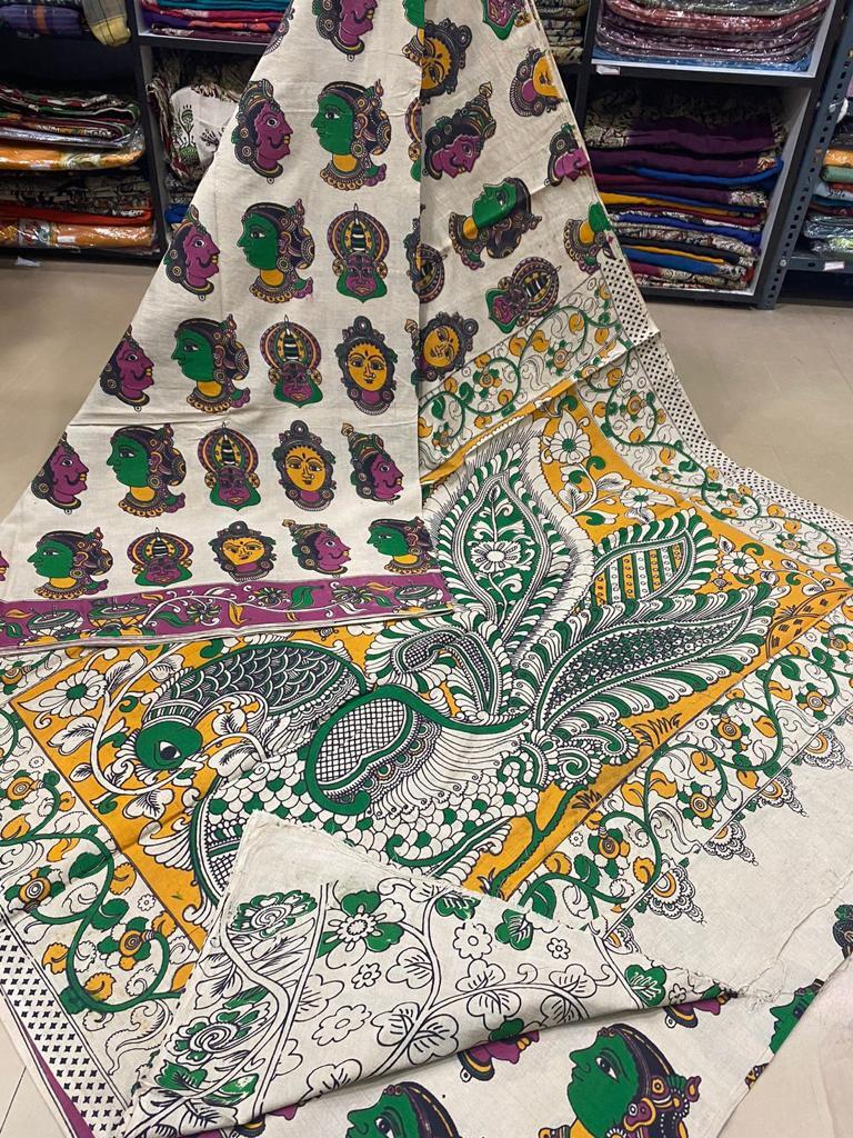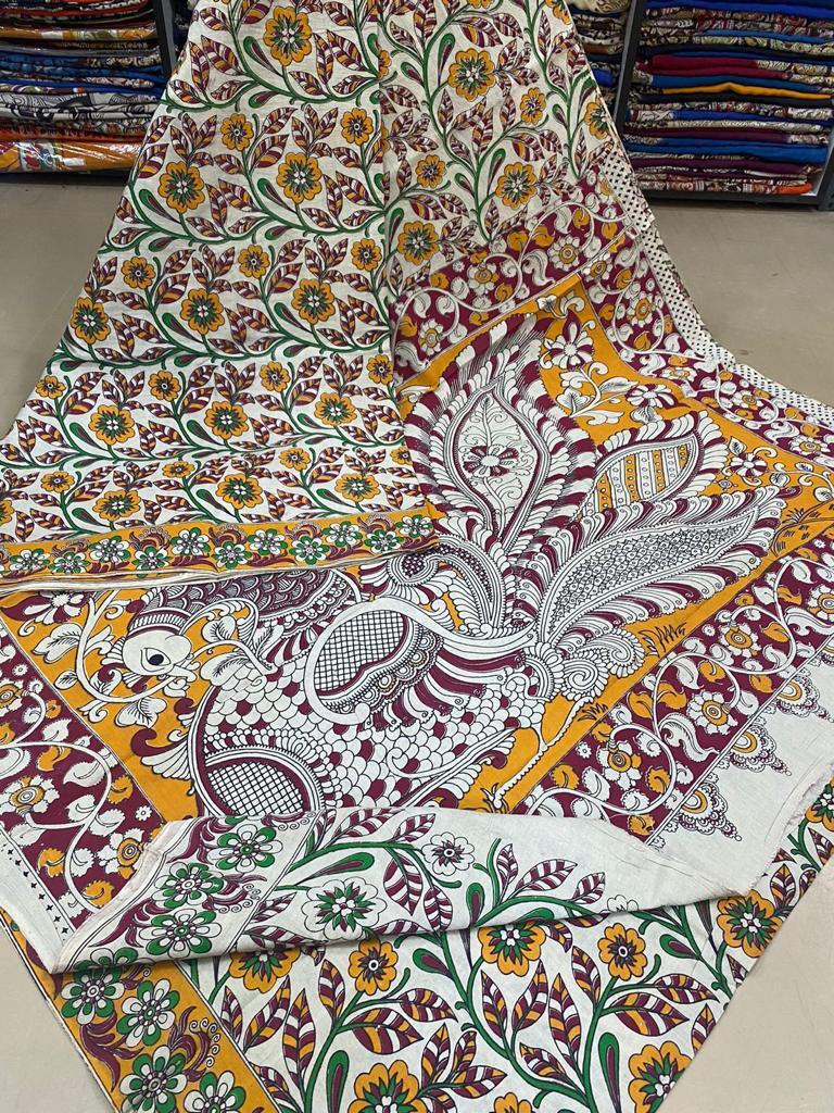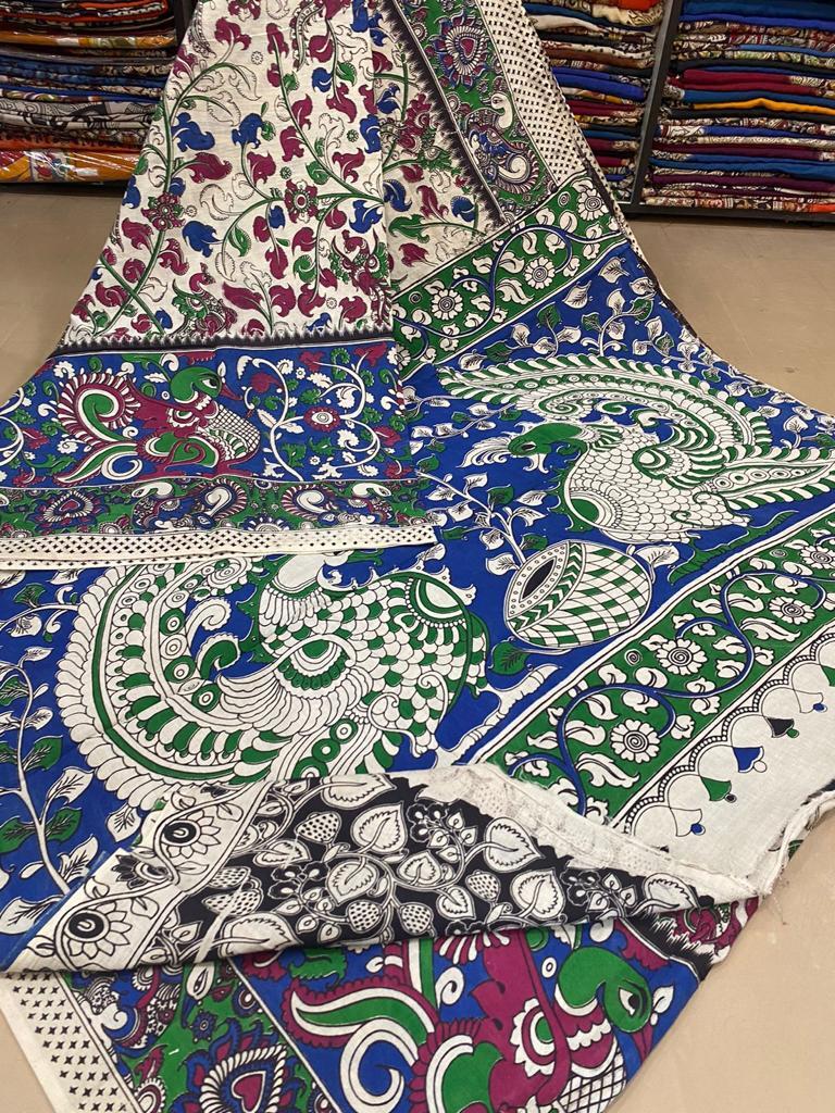 अलग-अलग रंगों में उपलब्ध कलमकारी प्रिंटेड सिल्क साड़ी