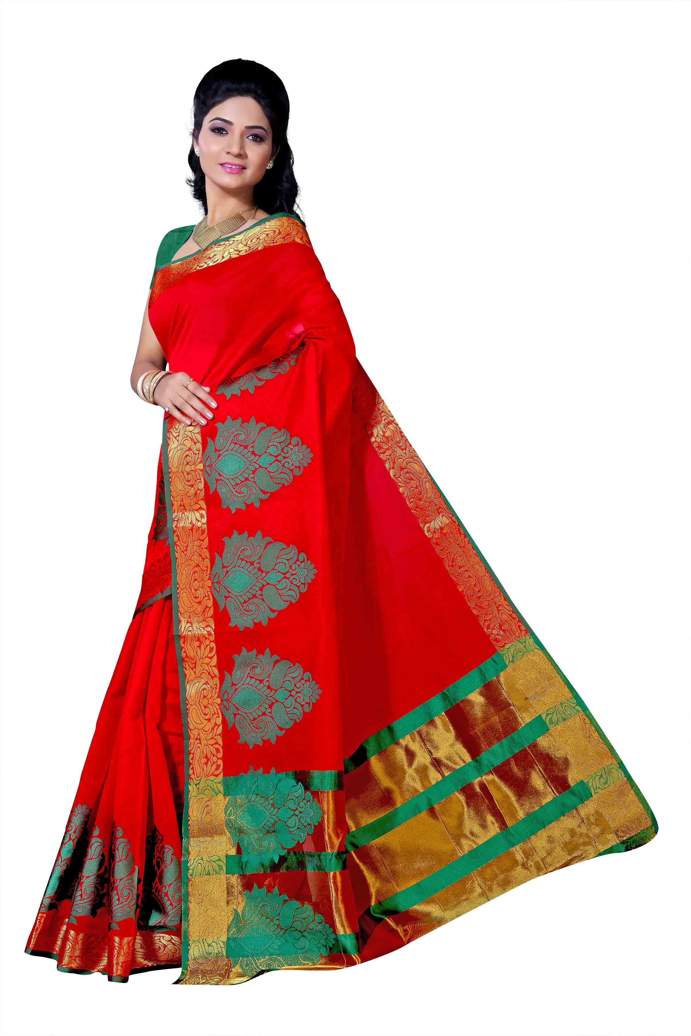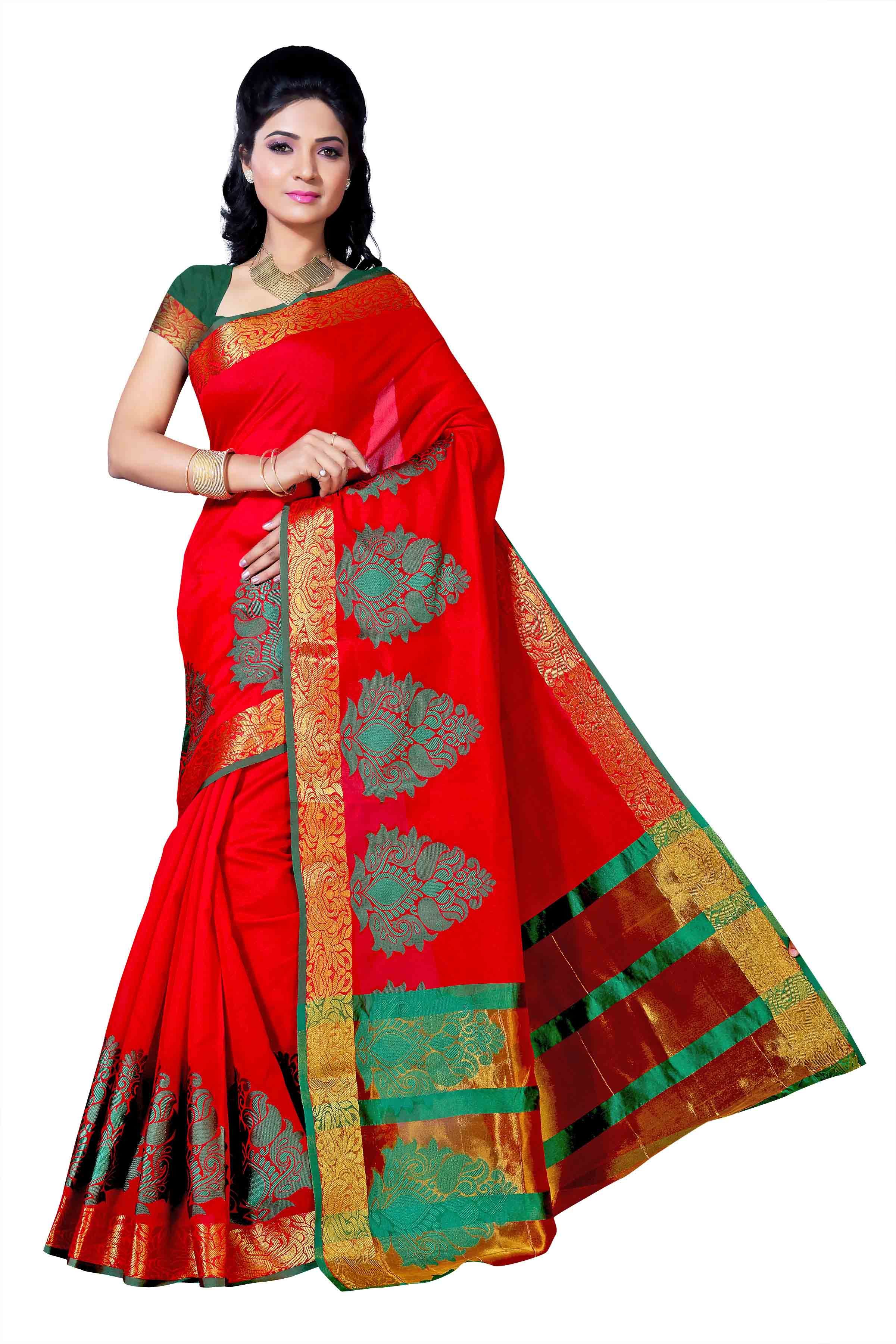 महिलाओं के लिए लाल कांचीपुरम सिल्क साड़ी के साथ पीली