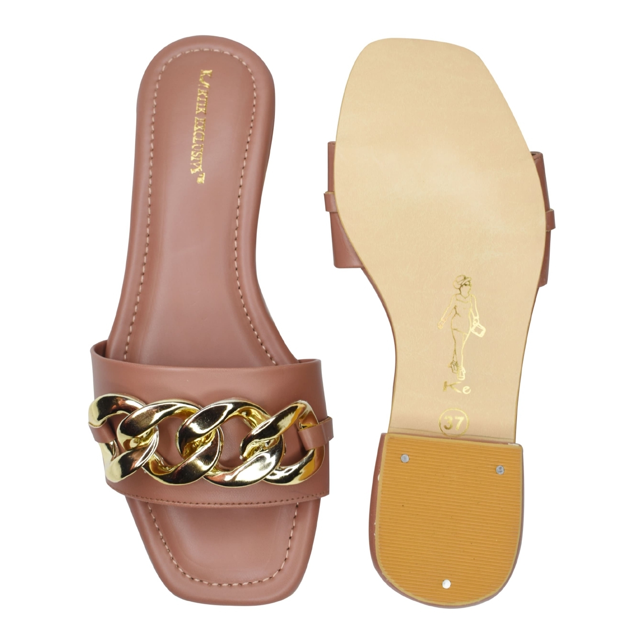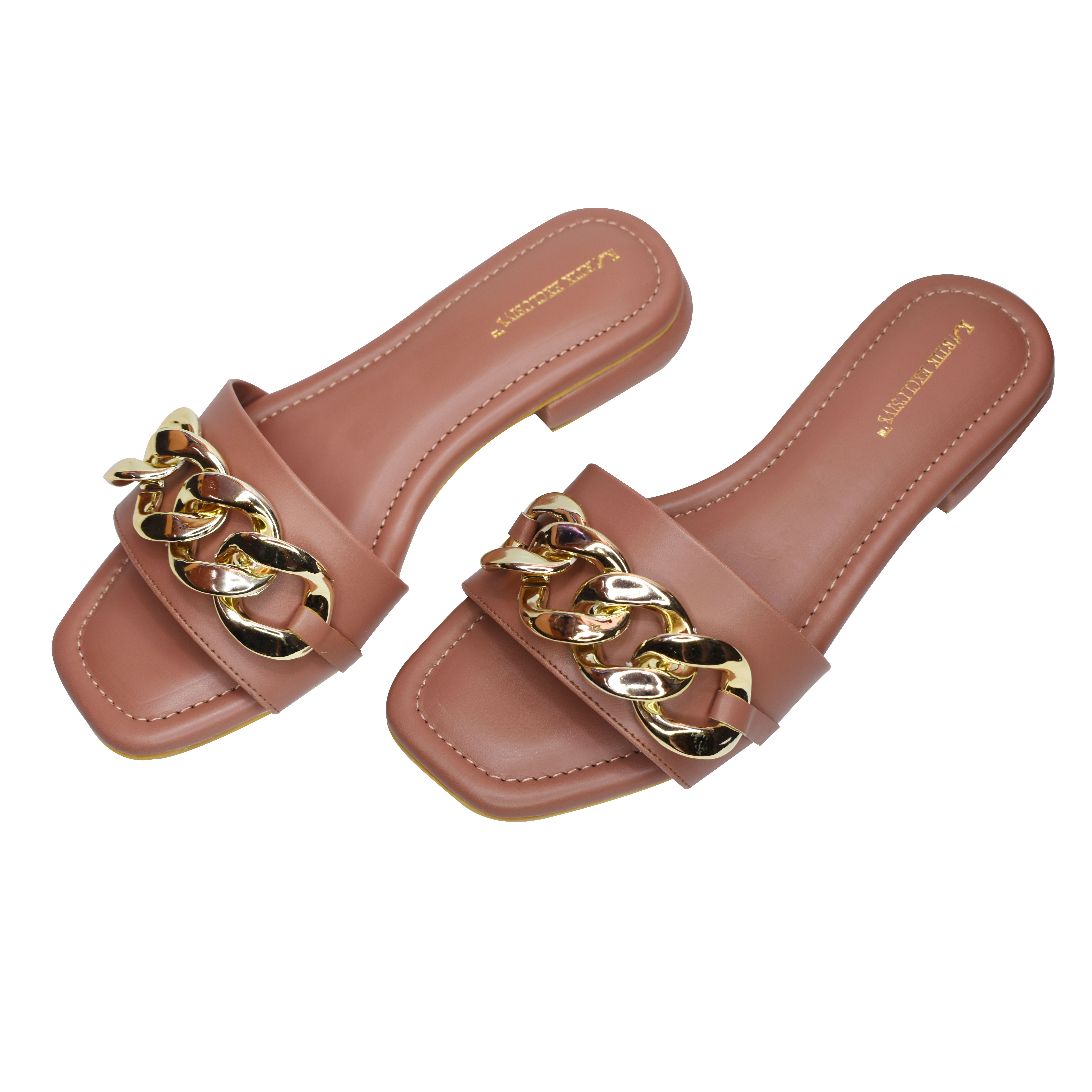 Explore in english - Ladies Brown Golden Chain Black Flat Sandal