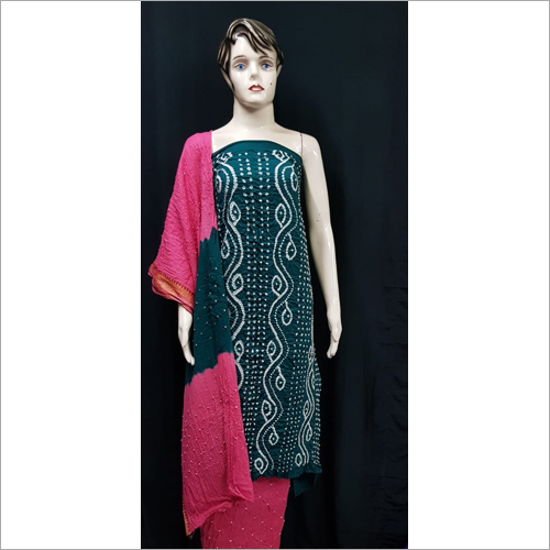 महिलाओं के लिए सलवार, कमीज और दुपट्टे के सेट के साथ प्रिंटेड बांधनी ड्रेस मटीरियल
