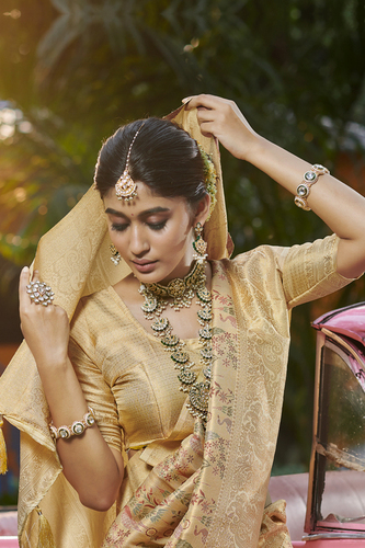 क्रीम रंग की महिलाओं की क्रश चिनोन साड़ी ब्लाउज़ और कमर बेल्ट के साथ