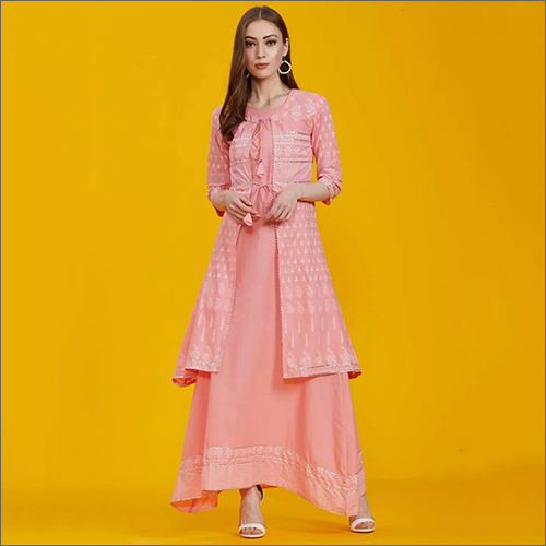 वॉशेबल लेडीज़ रेयॉन पीच श्रग कुर्ती लॉन्ग श्रग के साथ