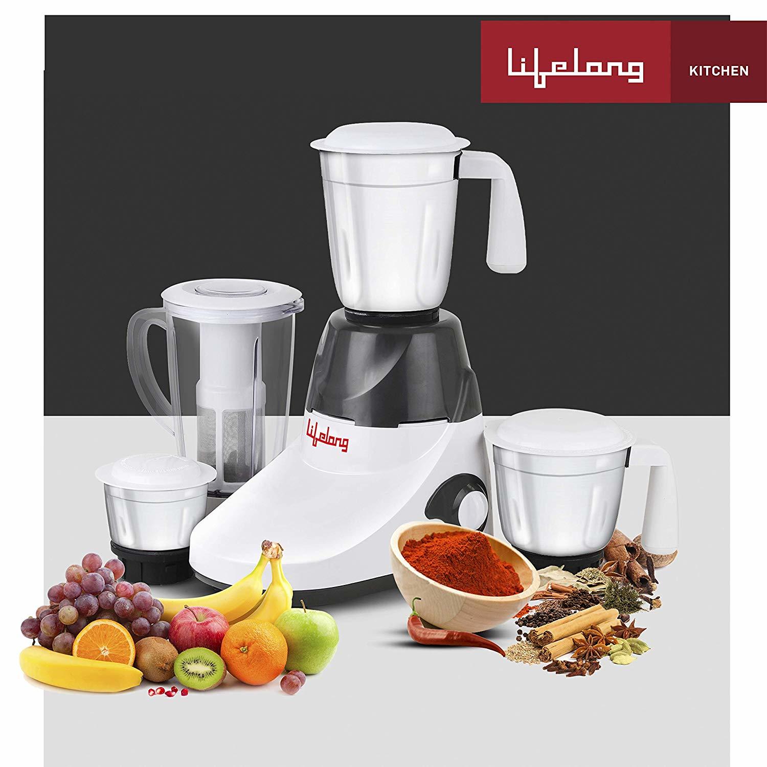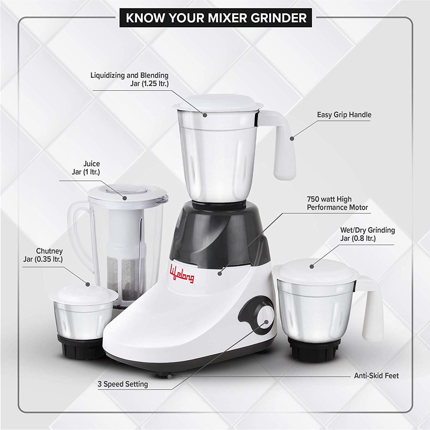 लाइफलॉन्ग 750 वॉट मिक्सर ग्राइंडर 3 स्टेनलेस स्टील जार + 1 जूसर जार के साथ, सफेद और ग्रे