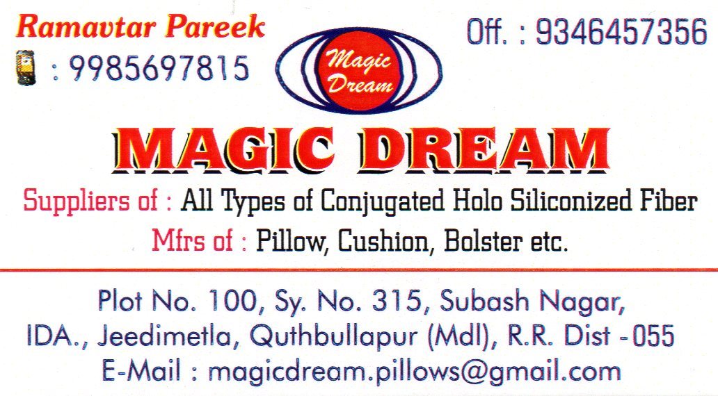 मैजिक ड्रीम, 2015 में तेलंगाना के हैदराबाद में स्थापित, भारत में तकिया और कवर का टॉप निर्माता,आपूर्तिकर्ता,व्यापार कंपनी है। मैजिक ड्रीम ट्रेड इंडिया के सूचीबद्ध उत्पादों के सत्यापित और विश्वसनीय विक्रेताओं में से एक है। आपूर्ति और व्यापार के अपने व्यापक अनुभव के साथ, मैजिक ड्रीम ने उच्च गुणवत्ता आदि के साथ बाजार में अपने लिए एक प्रतिष्ठित नाम बनाया है। ग्राहक केंद्रित दृष्टिकोण पर ध्यान केंद्रित करते हुए, मैजिक ड्रीम की अखिल भारतीय उपस्थिति है और पूरे देश में एक विशाल उपभोक्ता आधार को पूरा करता है। मैजिक ड्रीम से ट्रेड इंडिया के गुणवत्ता-सुनिश्चित उत्पादों () को थोक में खरीदें।