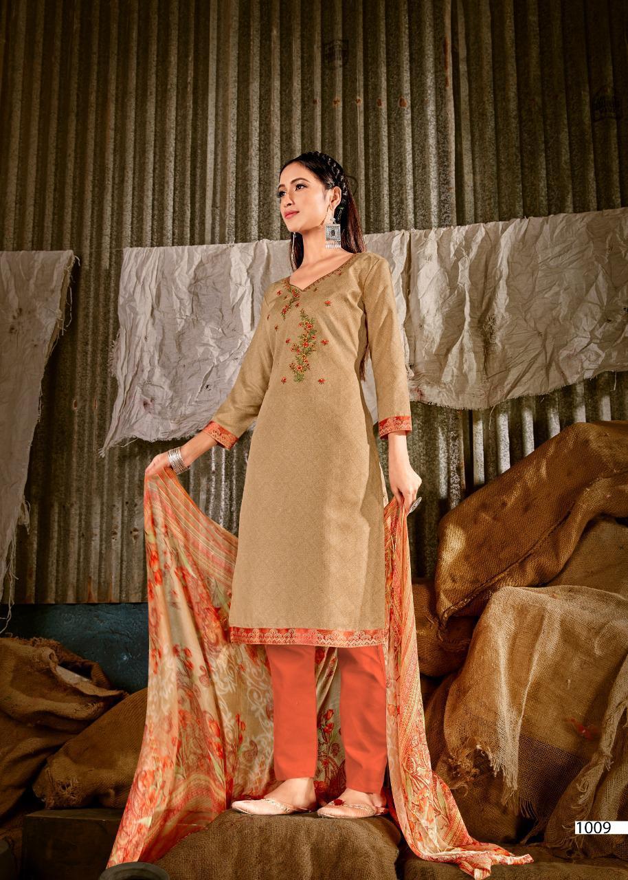 Explore in english - Meera Trend Florina Cotton With Print And Embroidery Work Dress Material Catalog