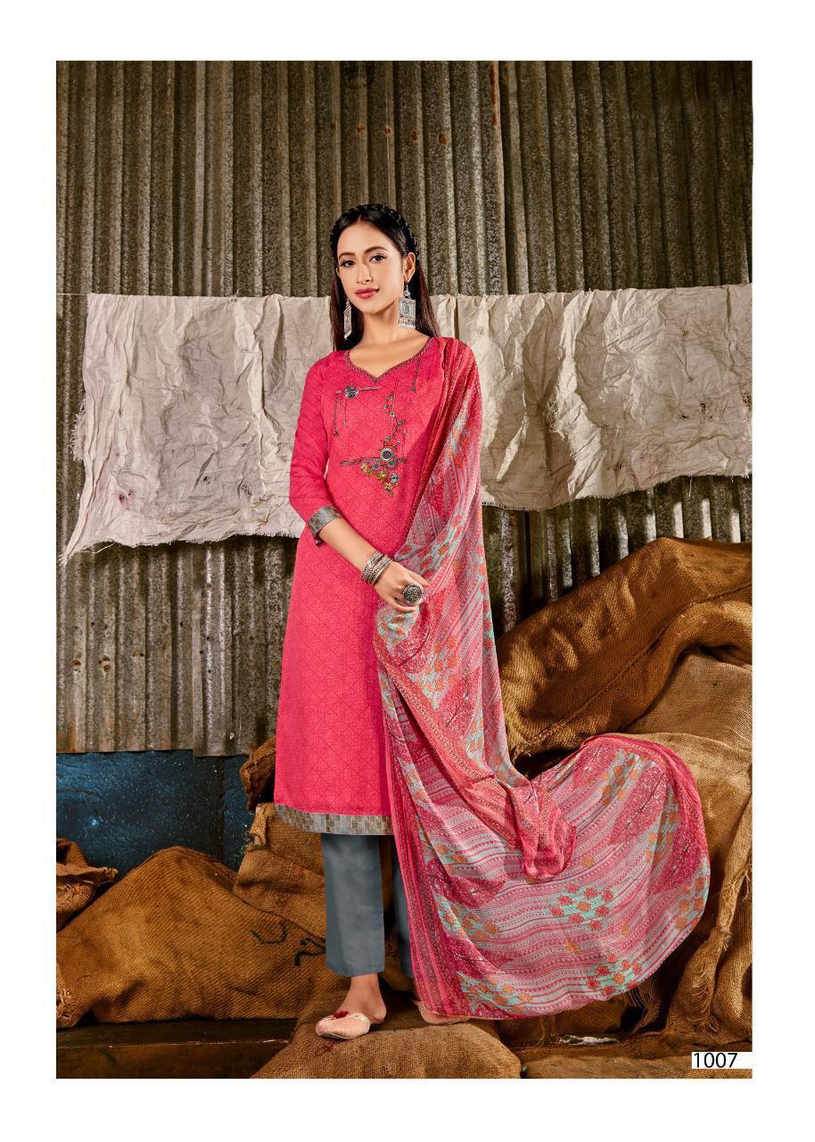 प्रिंट और एम्ब्रायडरी वर्क ड्रेस मटेरियल कैटलॉग के साथ मल्टी कलर मीरा ट्रेंड फ्लोरिना कॉटन