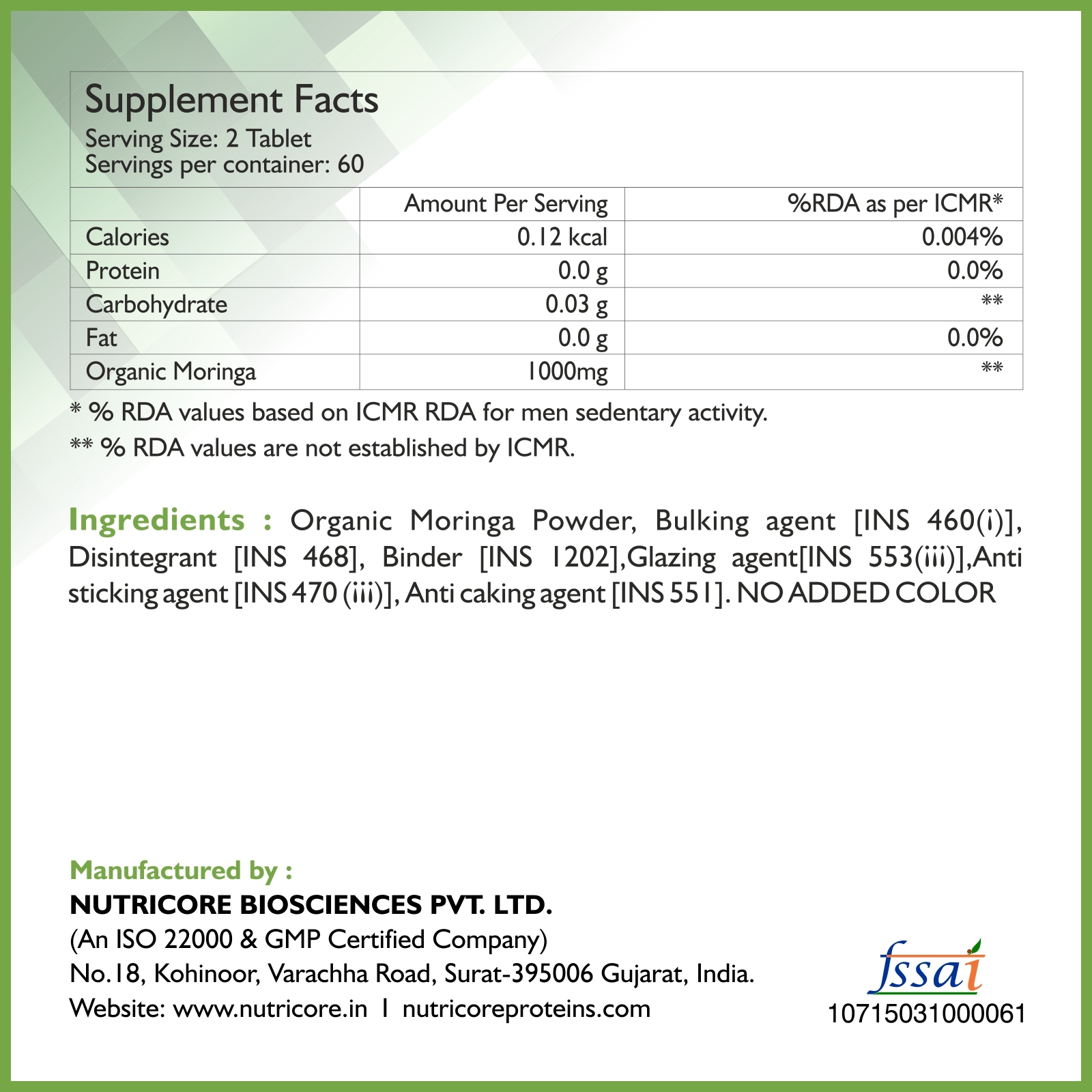 मोरिंगा टैबलेट आयु समूह: वयस्क