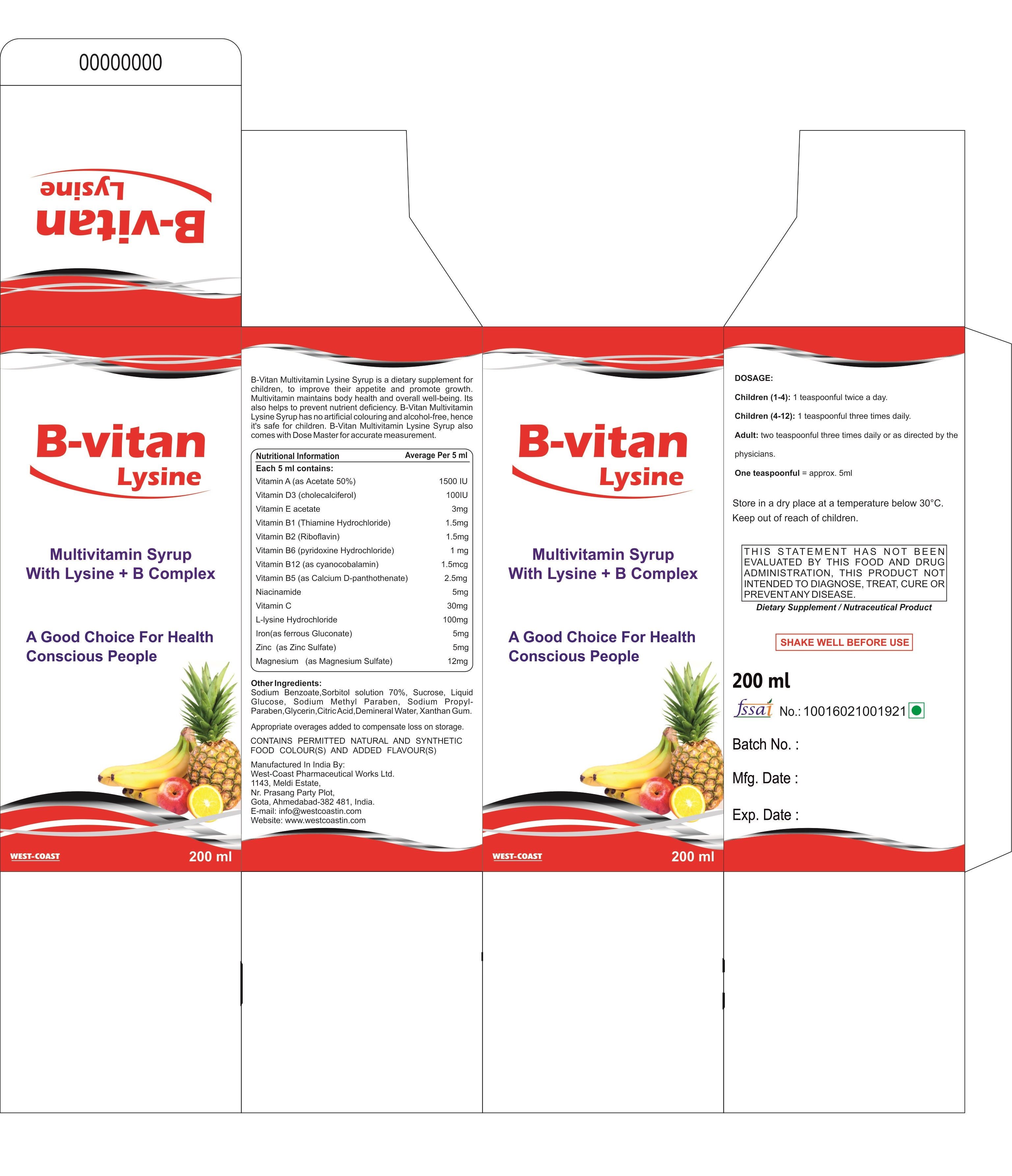 | सामग्रियां | Each 5 ml Contains : Vitamin A (as Acetate 50%) 1500 IU Vitamin D3 (Cholecalciferol) 100 IU Vitamin E Acetate 3 mg Vitamin B1 (Thiamine Hydrochloride) 1.5 mg Vitamin B2 (Riboflavin) 1.5 mg Vitamin B6 (Pyridoxine Hydrochloride) 1 mg Vitamin B12 (as Cyanocobalamin) 1.5 mcg Vitamin B5 (as Calcium D-Panthothenate)2.5 mg Niacinamide 5 mg Vitamin C 30 mg L-lysine Hydrochloride 100 mg Iron (as Ferrous Gluconate) 5 mg Zinc (as Zinc Sulfate) 5 mg Magnesium (as Magnesium Sulfate) 12 mg |