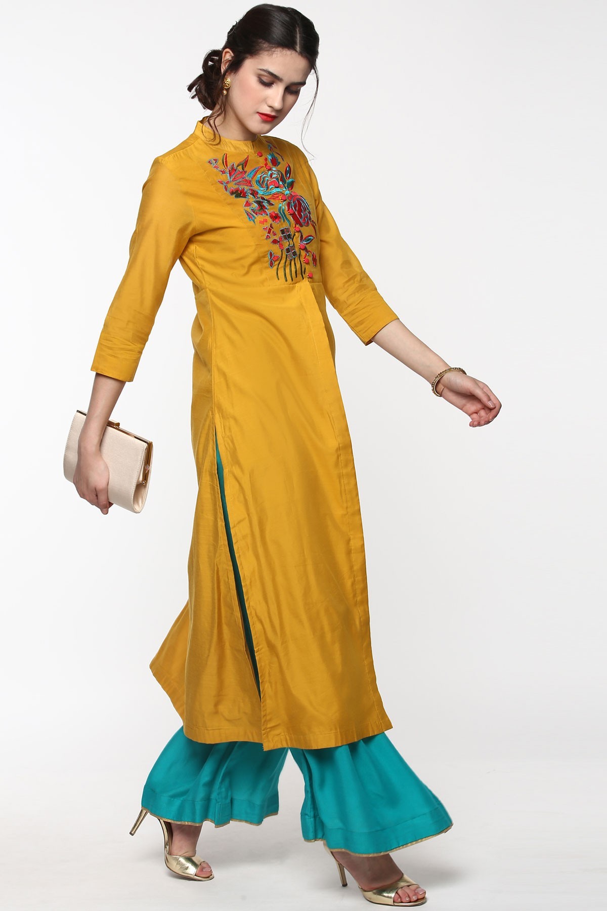 Explore in english - Mustard Embroidered Front & Side Slit Kurta