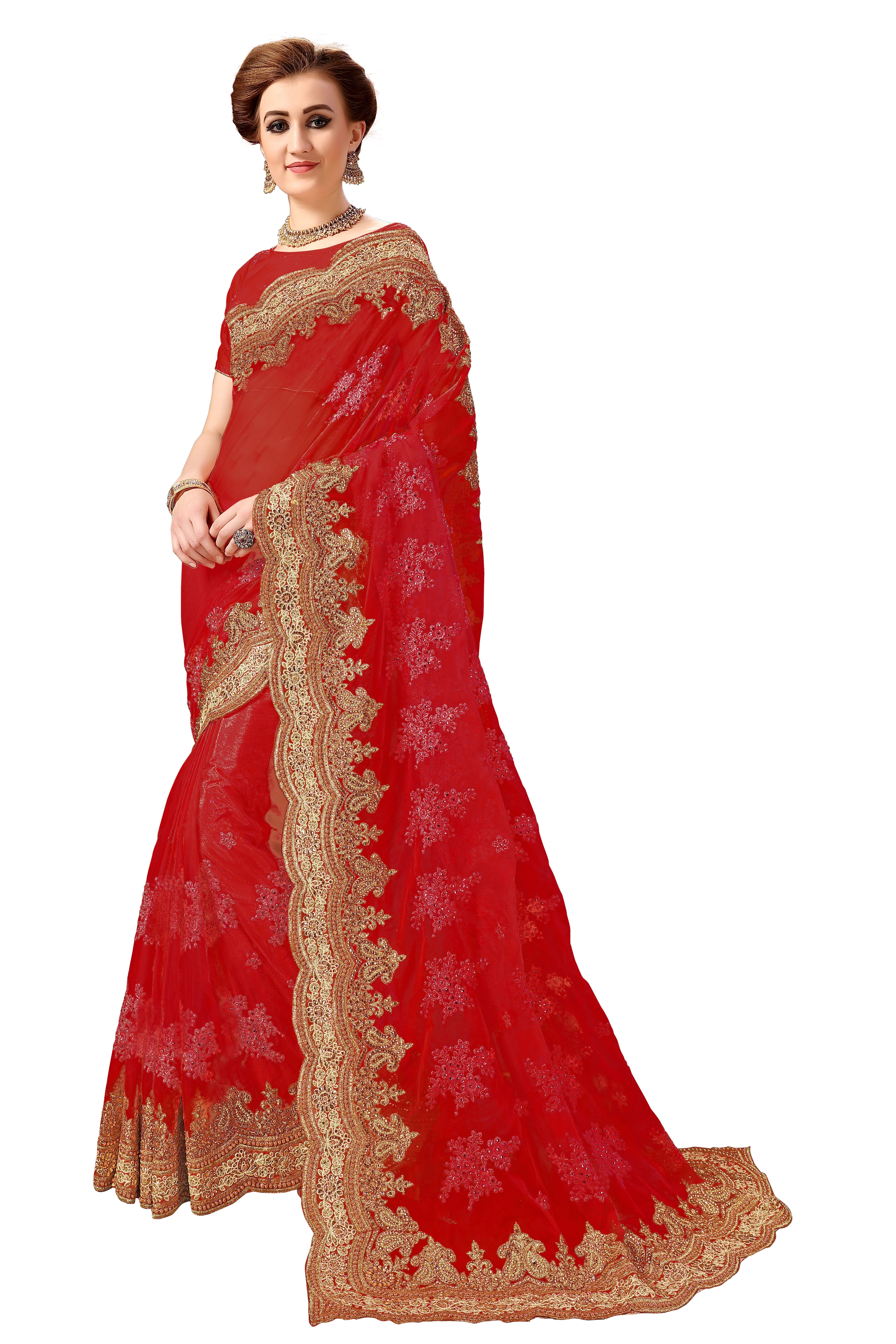 रेड नेट एम्ब्रॉयडरी वर्क साड़ी