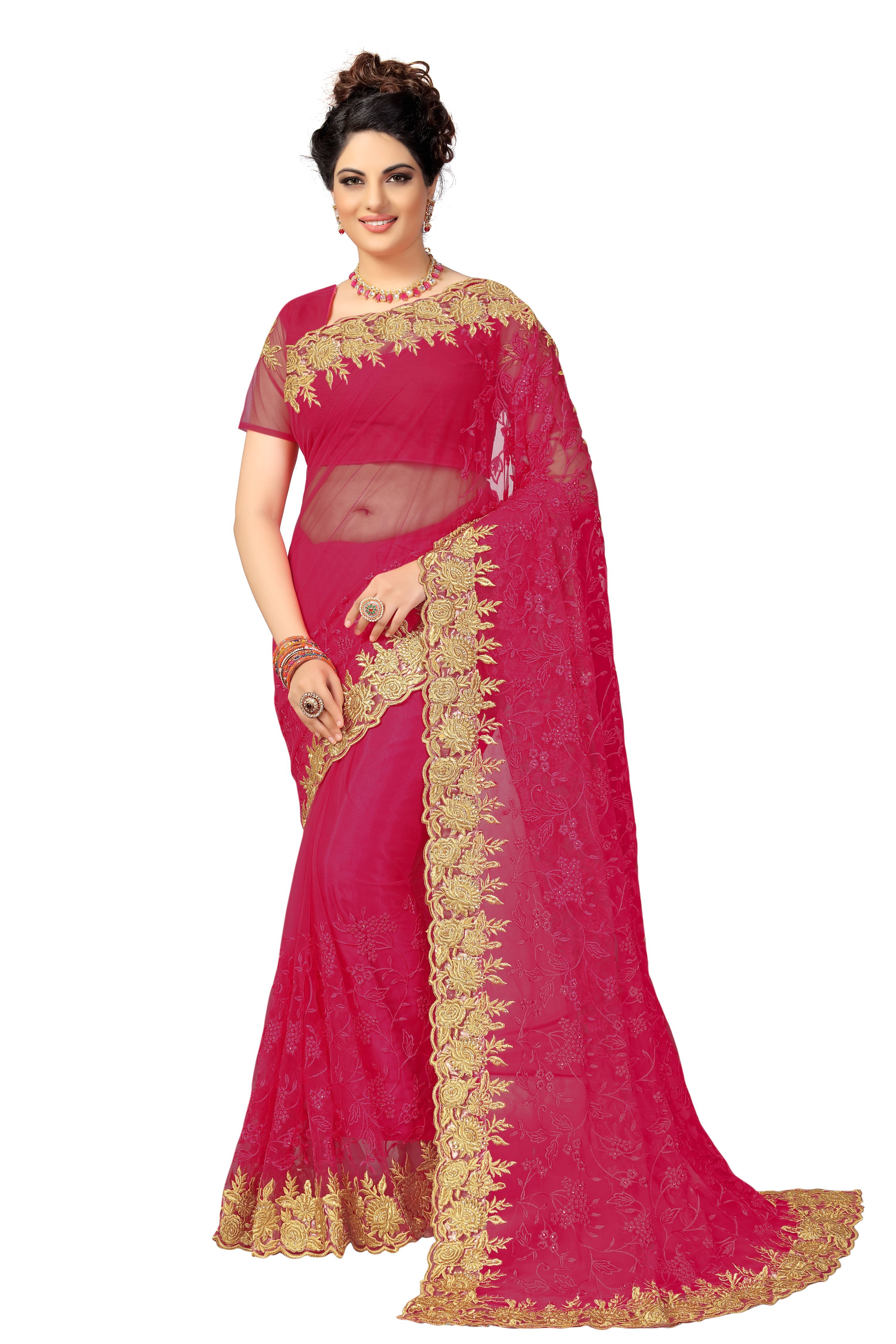 पिंक नेट हैवी एम्ब्रॉयडरी वर्क साड़ी