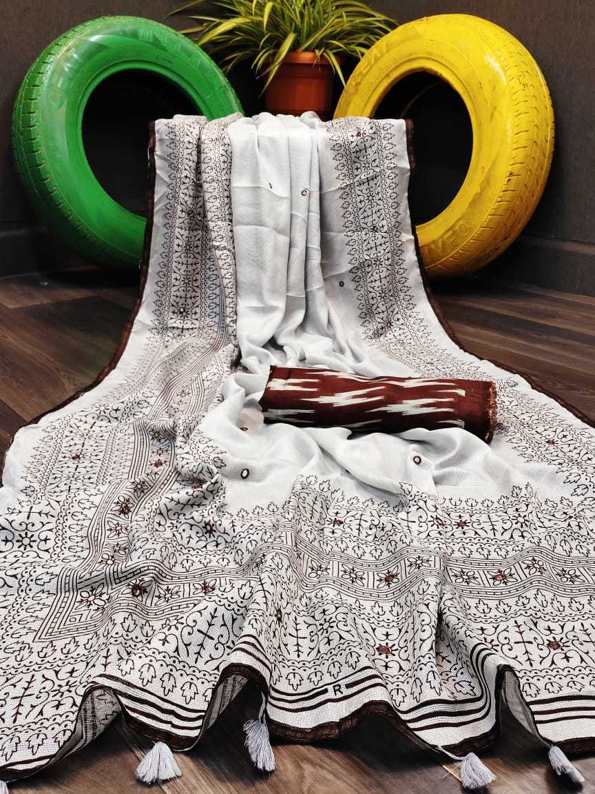 क्रीम रंग की महिलाओं की क्रश चिनोन साड़ी ब्लाउज़ और कमर बेल्ट के साथ