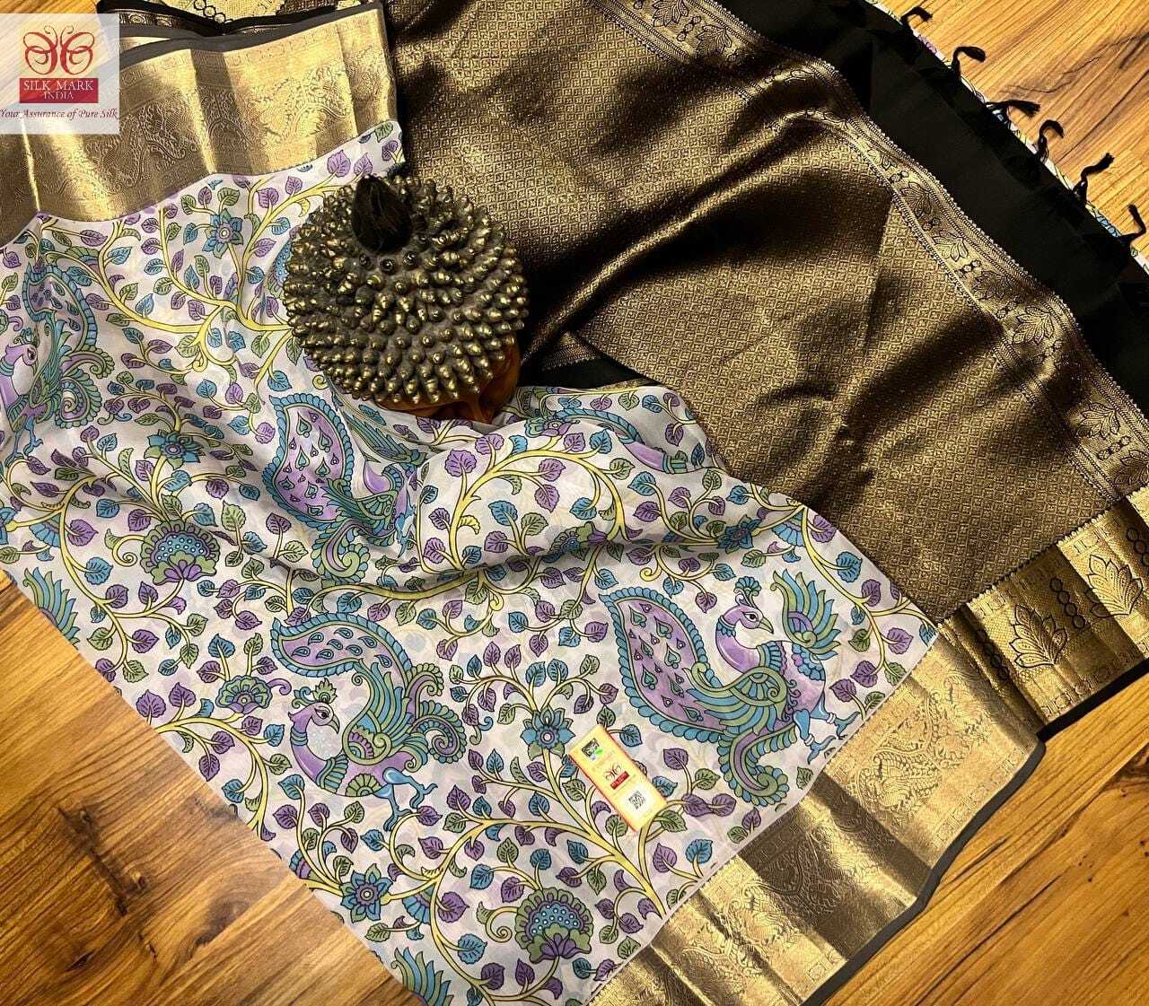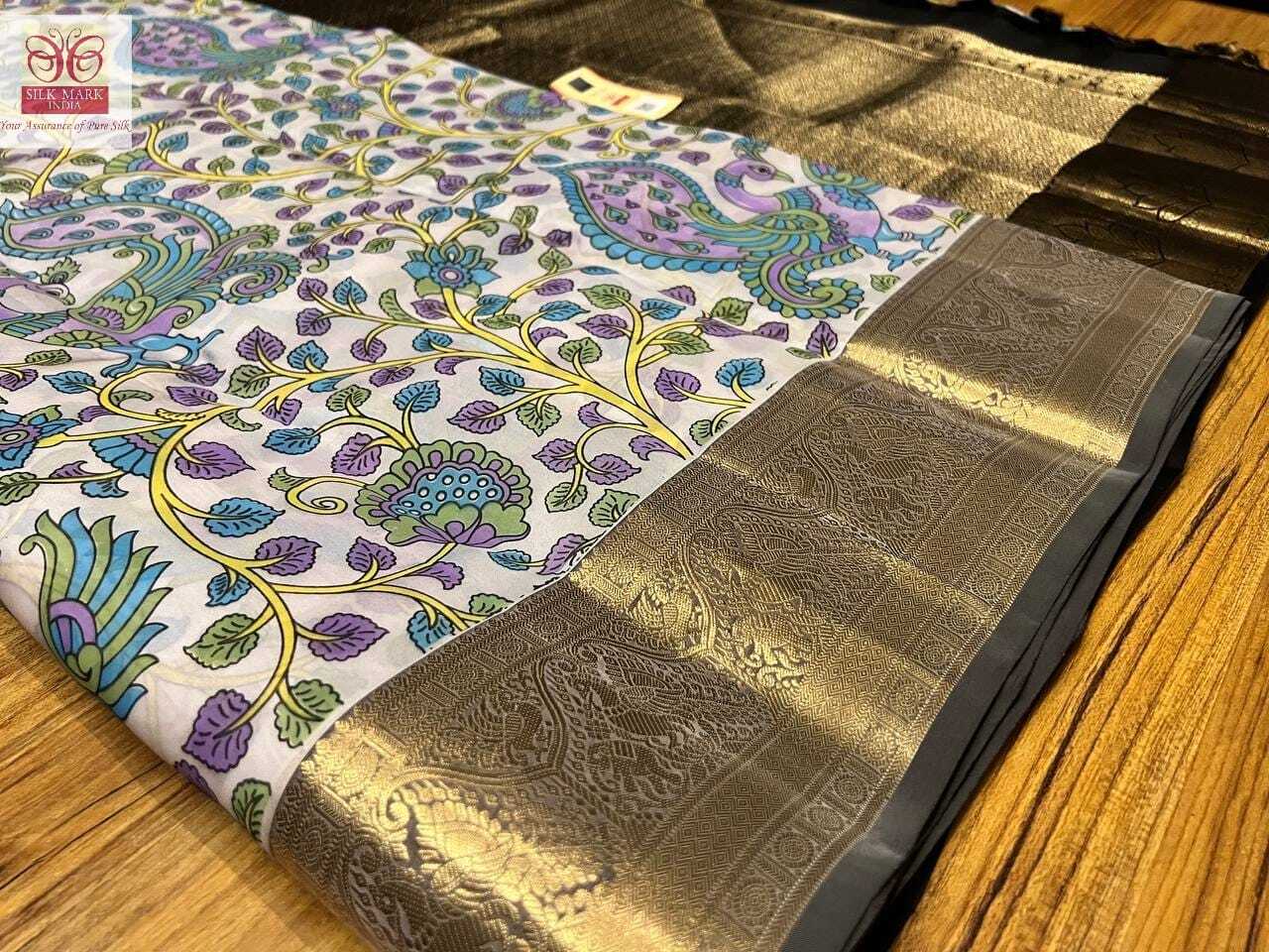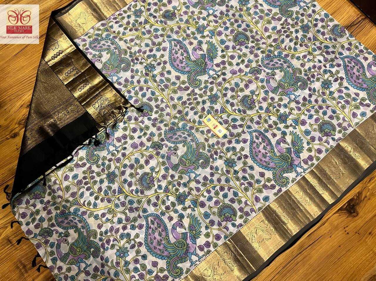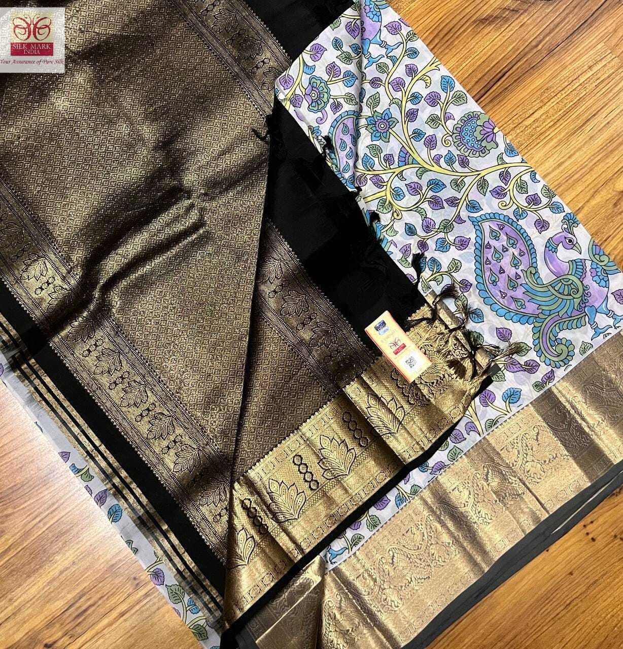 व्हाइट विथ बलैक न्यू कलमकारी कांचीपुरम सिल्क साड़ी