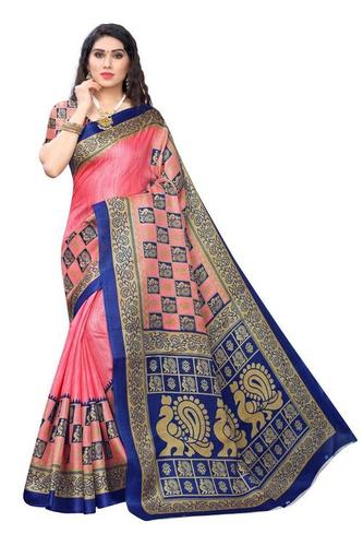 पिंक (गुलाबी) महिलाओं के लिए कॉटन ब्लेंड बेज प्रिंटेड साड़ी ब्लाउज पीस के साथ
