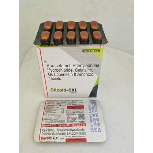 | सामग्रियां | PARACETAMOL 325MG , PHENYLEPHRINE CETIRIZINE HYDROCHLORIDE 5MG , GUAIPHENESIN 50 MG &AMBROXOL HYDROCHLORIDE 15 MGTABLETS |
