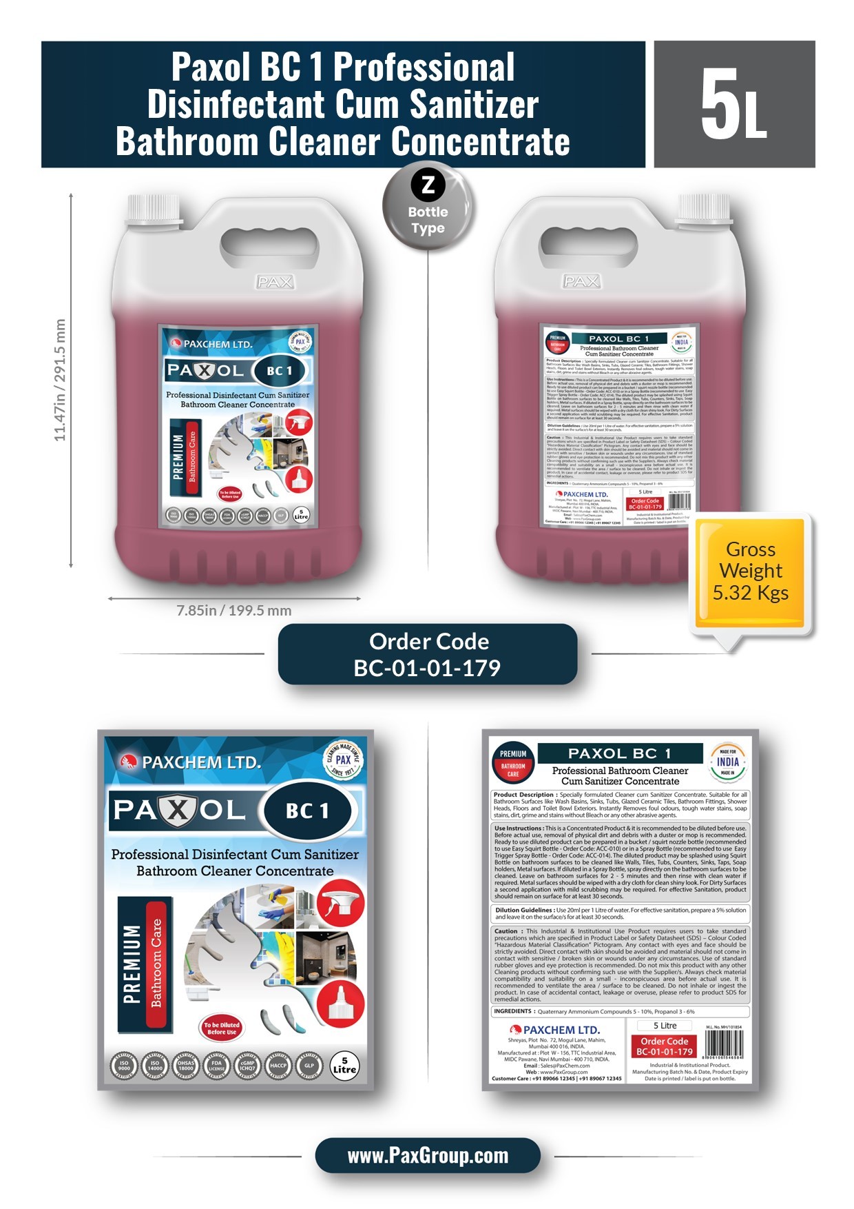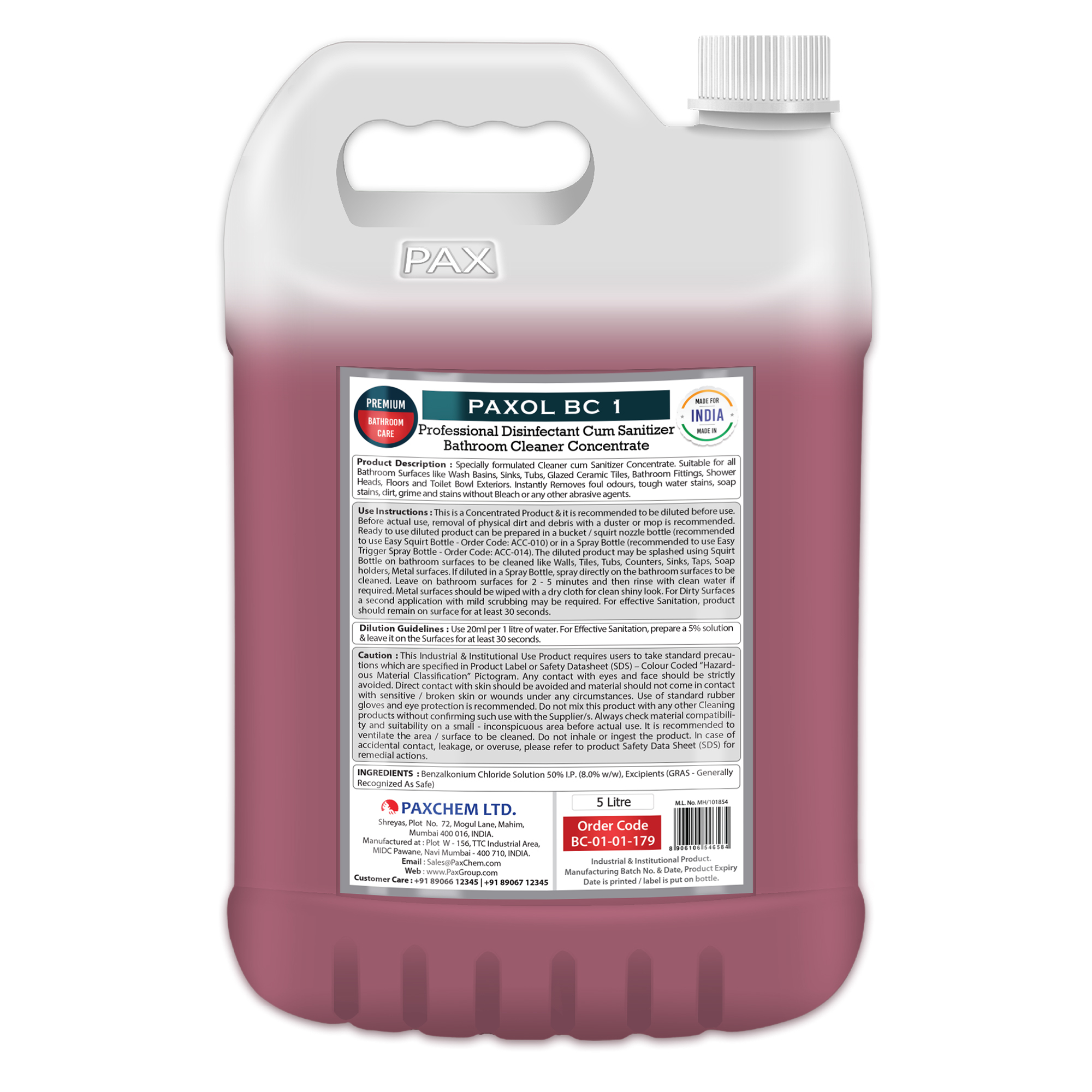 Paxol Bc 1 - पेशेवर कीटाणुनाशक सह सैनिटाइज़र बाथरूम क्लीनर कॉन्सेंट्रेट आकार: 5 L