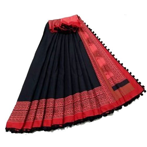 सादा काला और लाल सुंदर स्टाइलिश सांस लेने योग्य डिज़ाइनर महिलाओं के लिए आधुनिक और ट्रेंडी कॉटन साड़ी पहनते हैं