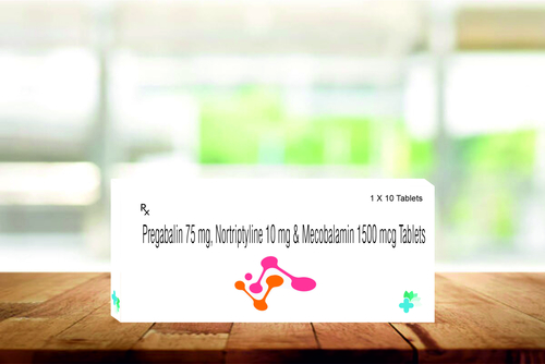 व्हाइट प्रीगैबलिन 75 मिलीग्राम, नॉर्ट्रिप्टिलाइन 10 मिलीग्राम और मेकोबालामिन 1500 एमसीजी टैबलेट