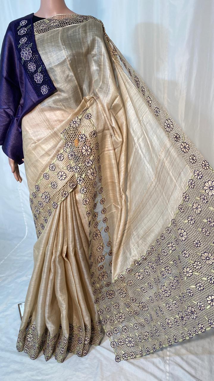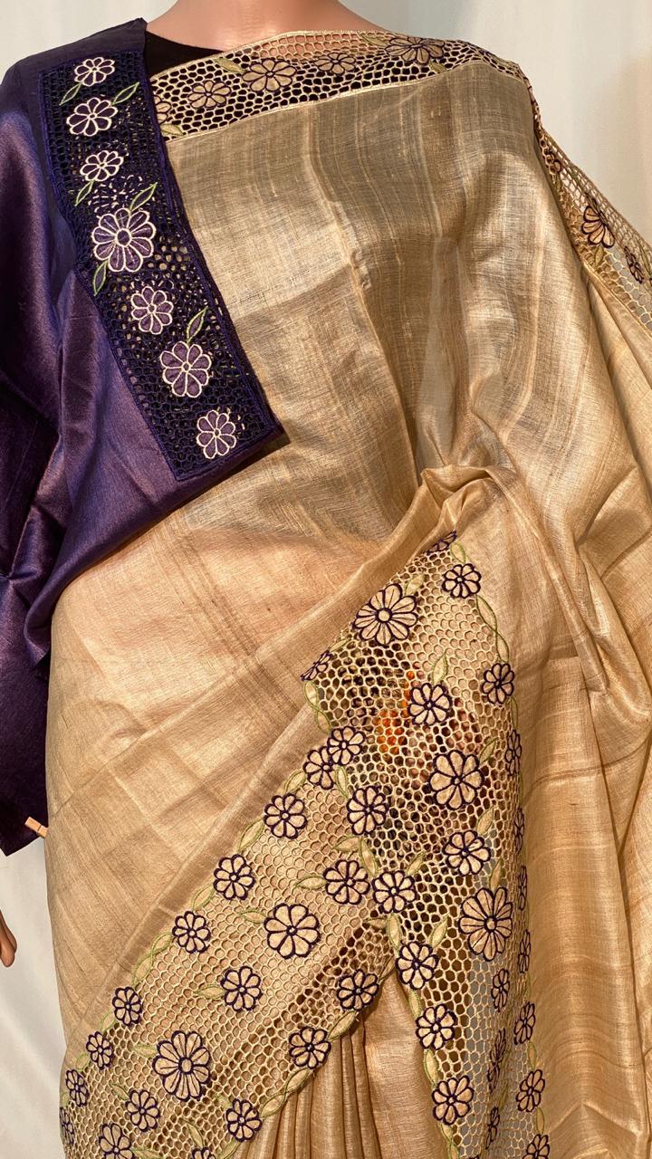 पार्टी वियर प्योर लिनन सिल्क मशीन कंप्यूटराइज्ड एम्ब्रॉयडरी साड़ी ब्लाउज के साथ