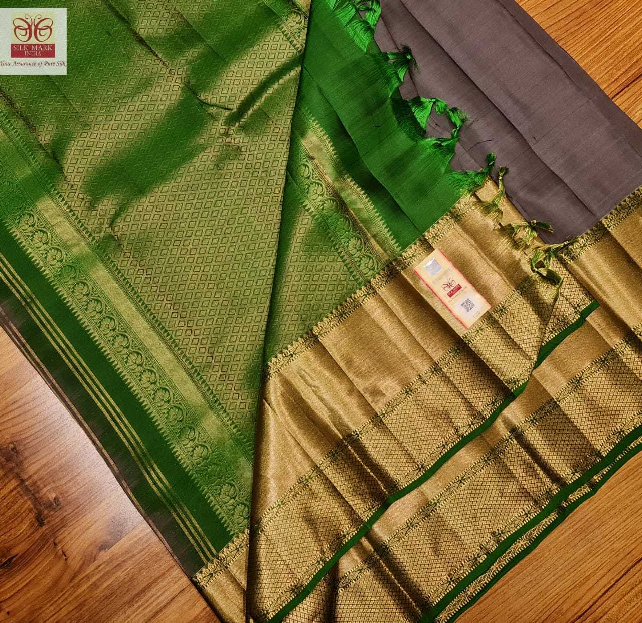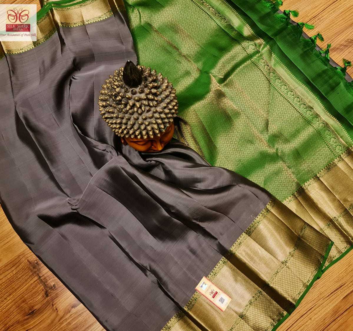 ग्रे हरे रंग की शुद्ध कांचीपुरम फैंसी सिल्क साड़ी के साथ