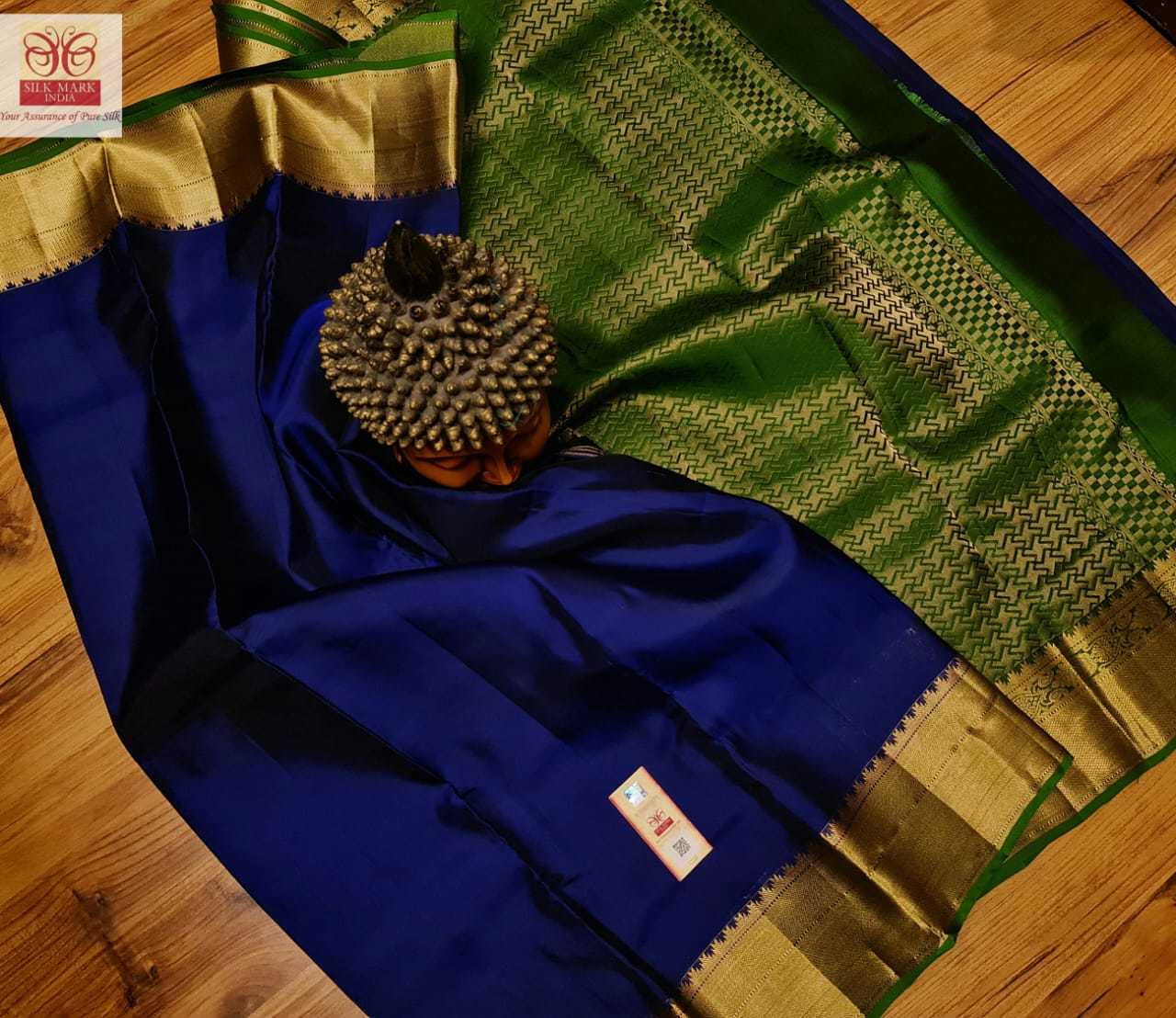 हरे रंग की शुद्ध कांचीपुरम सिल्क साड़ी के साथ नीला फैंसी सिल्क
