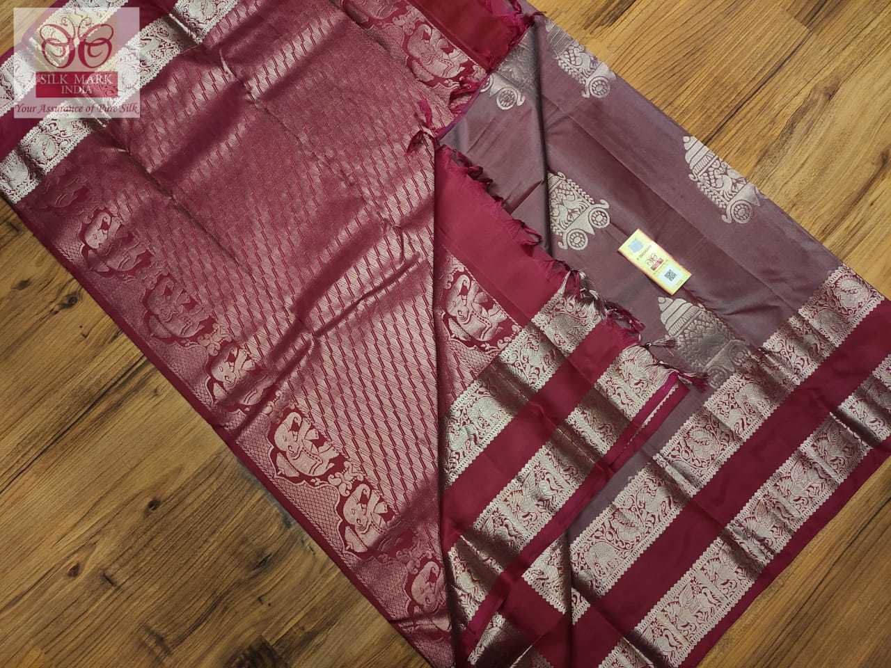 प्रिंटेड ग्रे और मैरोन पार्टी वियर असम सिल्क साड़ी अनस्टिच्ड ब्लाउज पीस के साथ