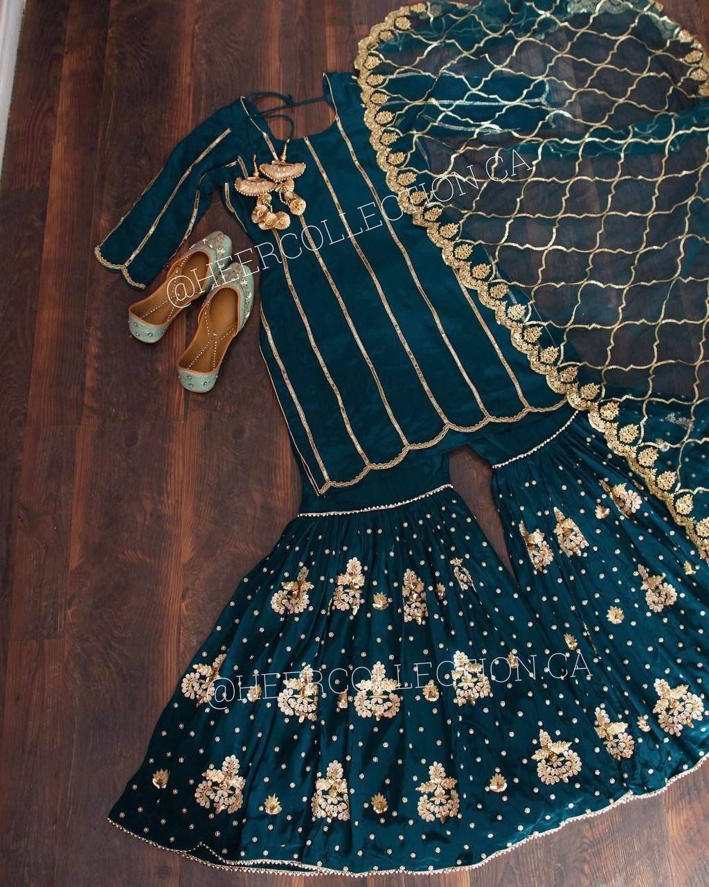 - एम्ब्रॉयडरी डिज़ाइनर पार्टी वियर लुक टॉप प्लाज़ो दुपट्टा सेट के साथ प्योर परम्परा सिल्क