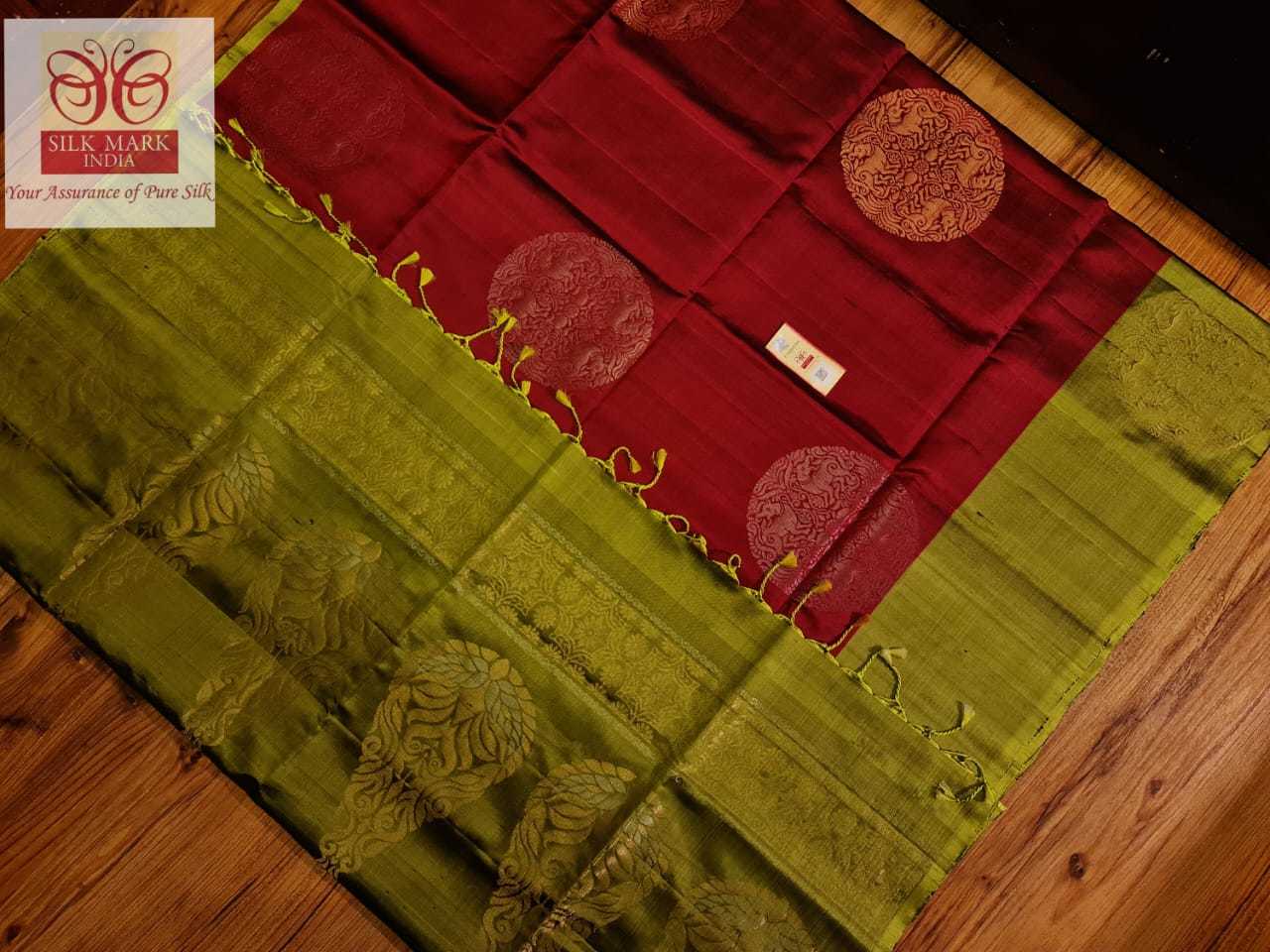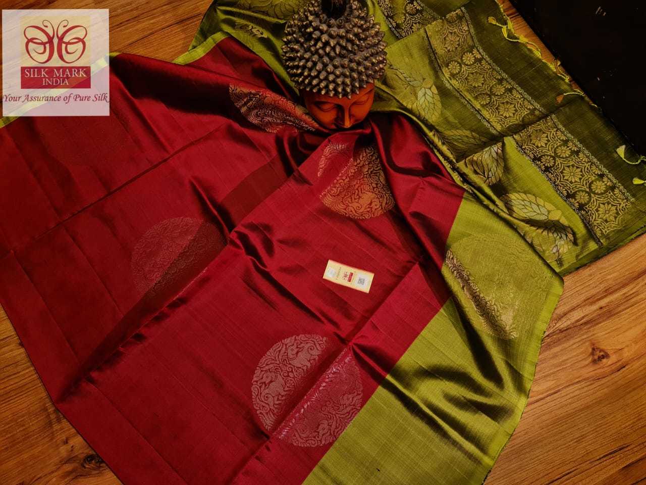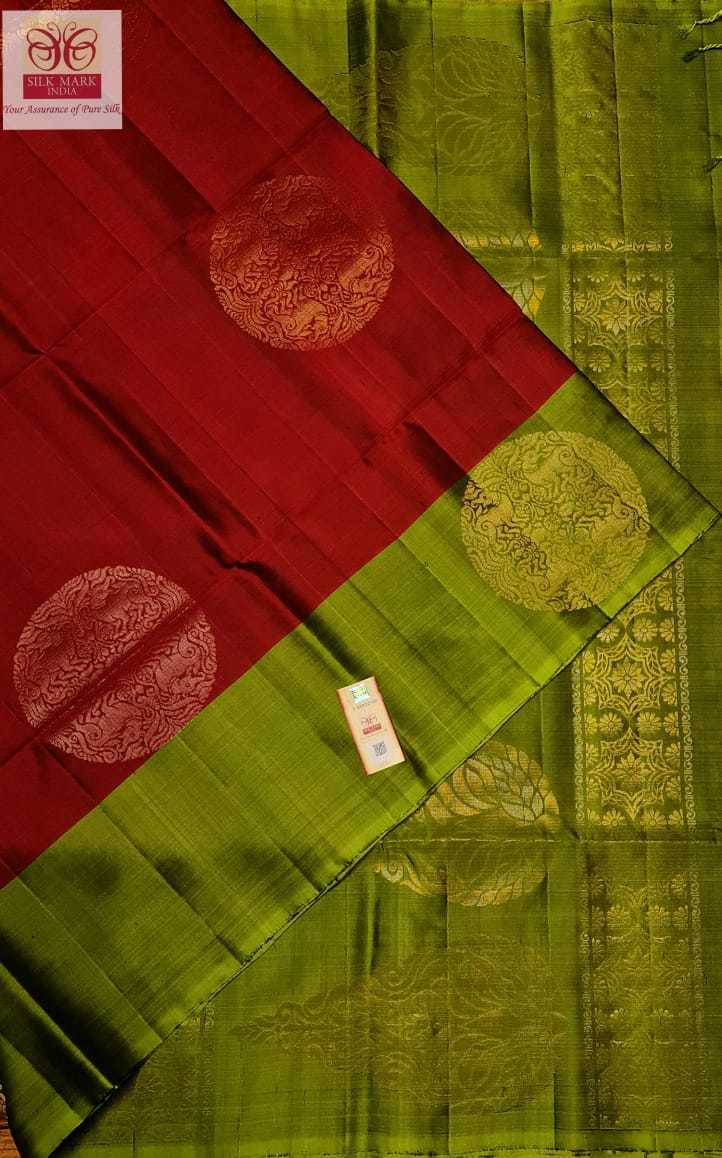 हरे रंग के प्योर सिल्क हैंडलूम के साथ मैरॉन अवराता बुटा