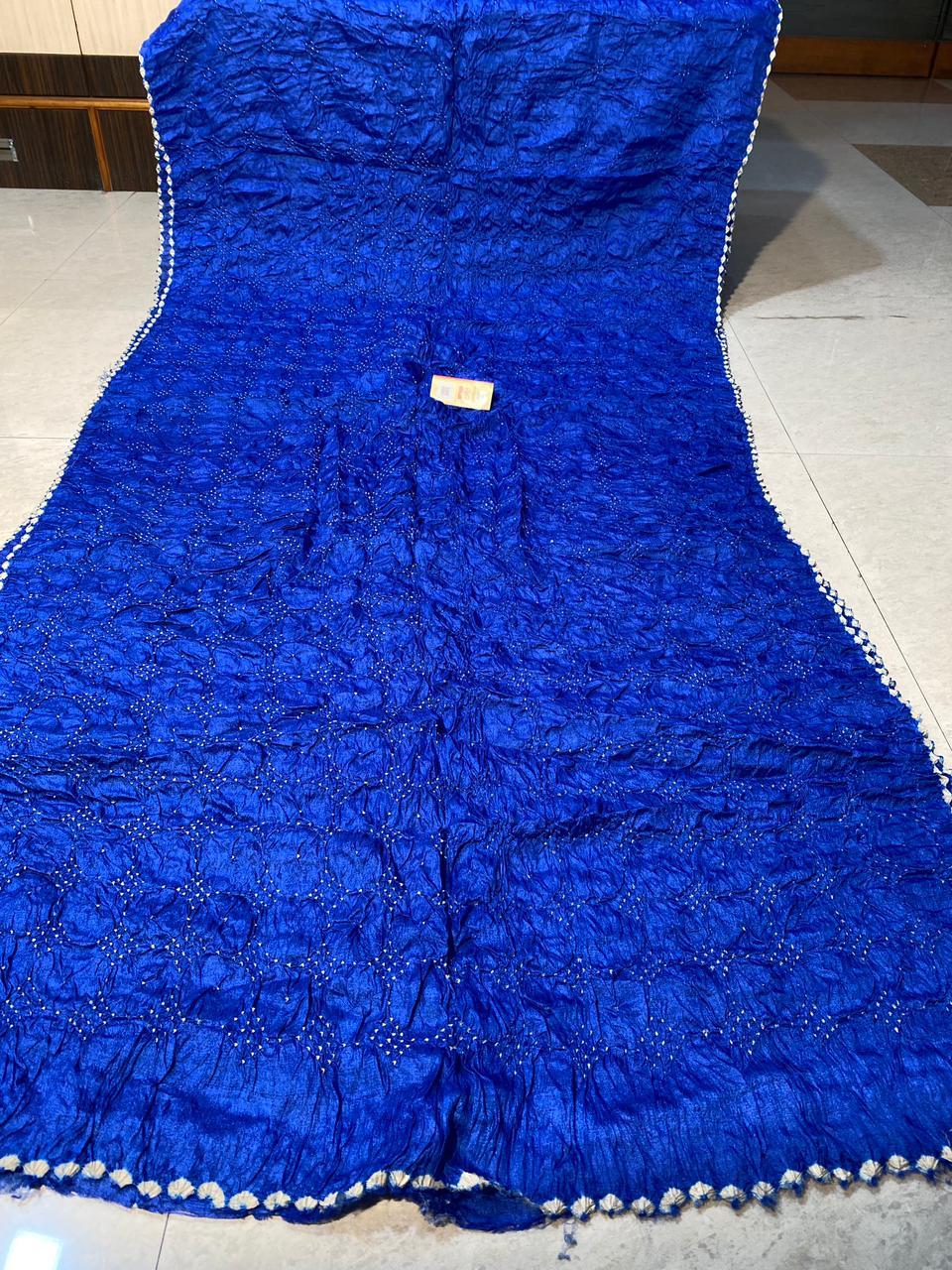 ब्लाउज के साथ साड़ी के चारों ओर किनारों पर नीला प्योर टसर बांधनी डिज़ाइनर बंदेहज.