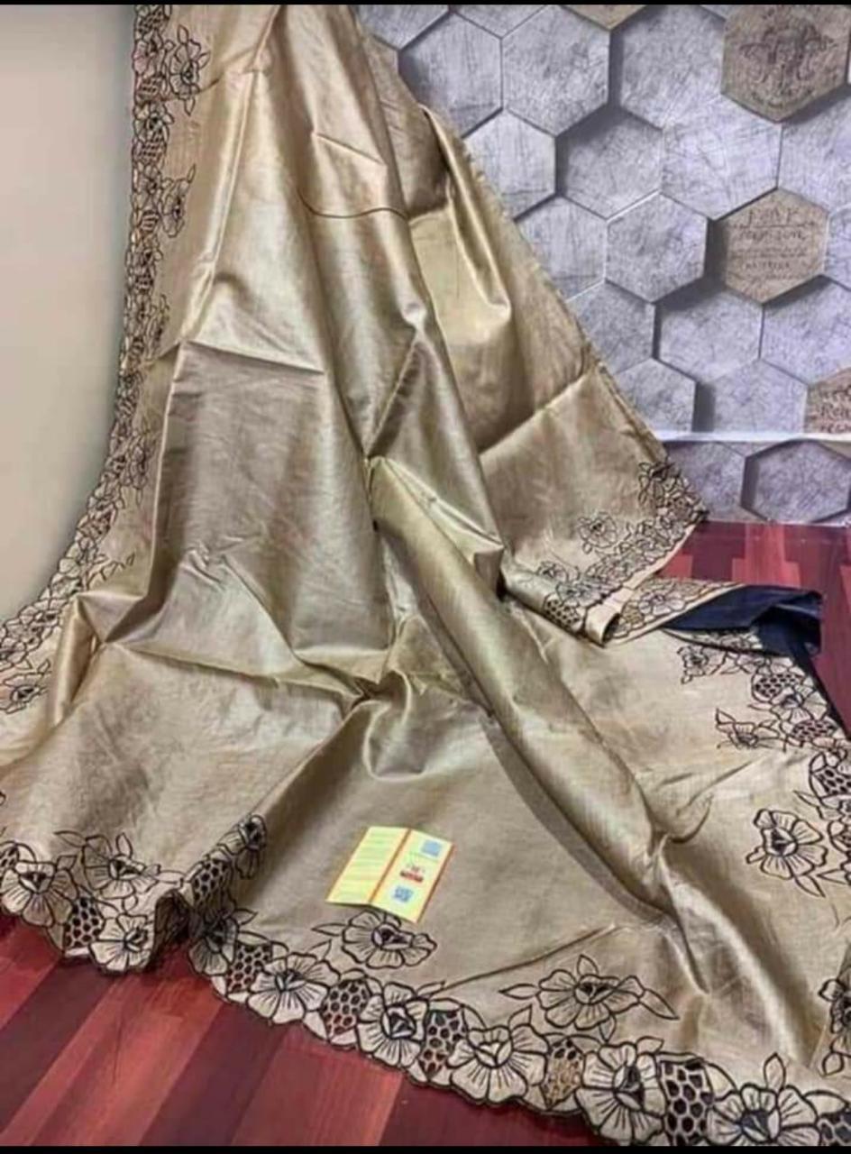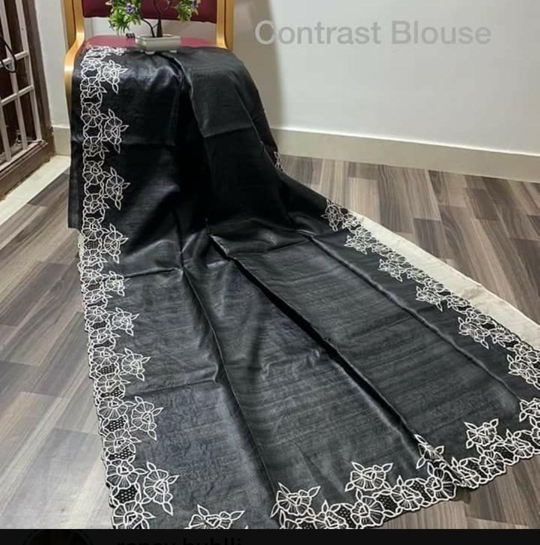 पार्टी वियर प्योर टसर सिल्क कट वर्क साड़ी कंट्रास्ट ब्लाउज के साथ.