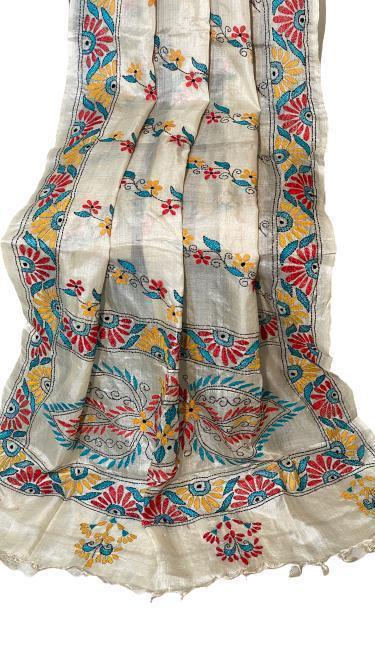 Explore in english - PURE TUSSAR SILK KANTHA EMBROIDERED (BY HANDS) LONG 2.5 MTRS DUPATTA .