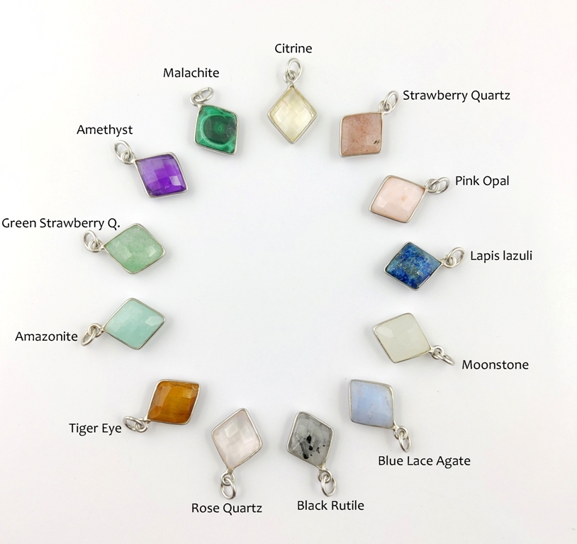 Explore in english - Rainbow Moonstone Gemstone Diamond Shape Sterling Silver 11x13mm Bezel Charm