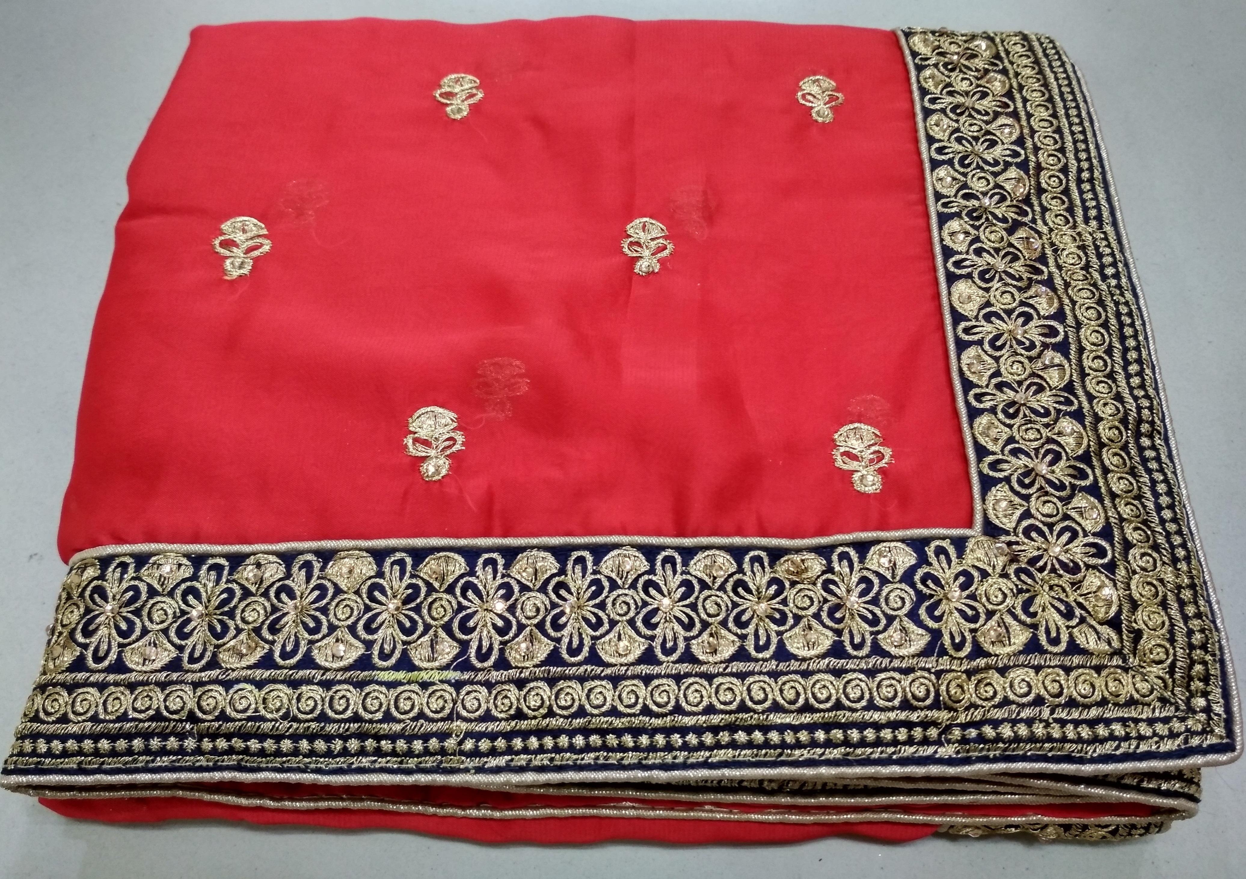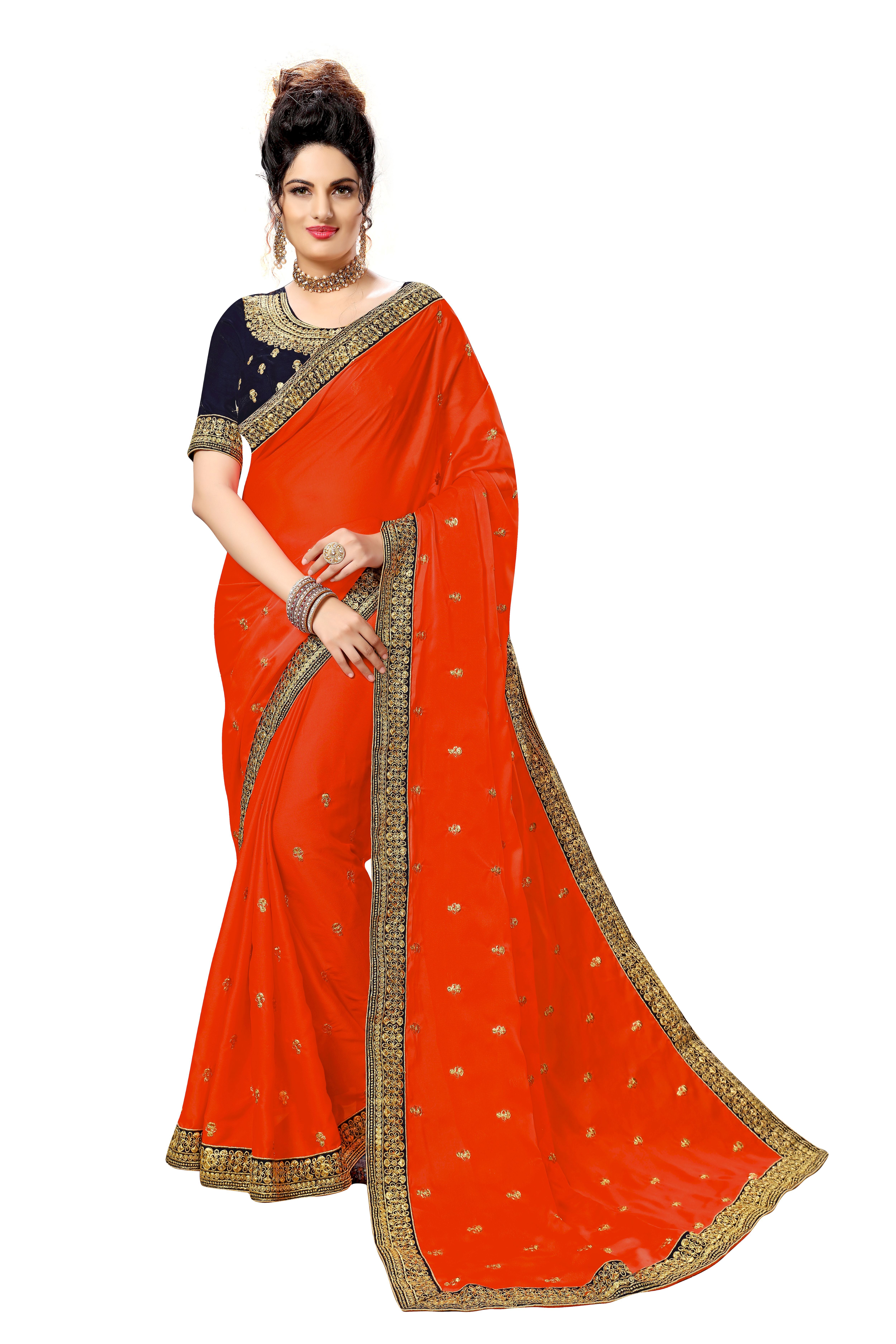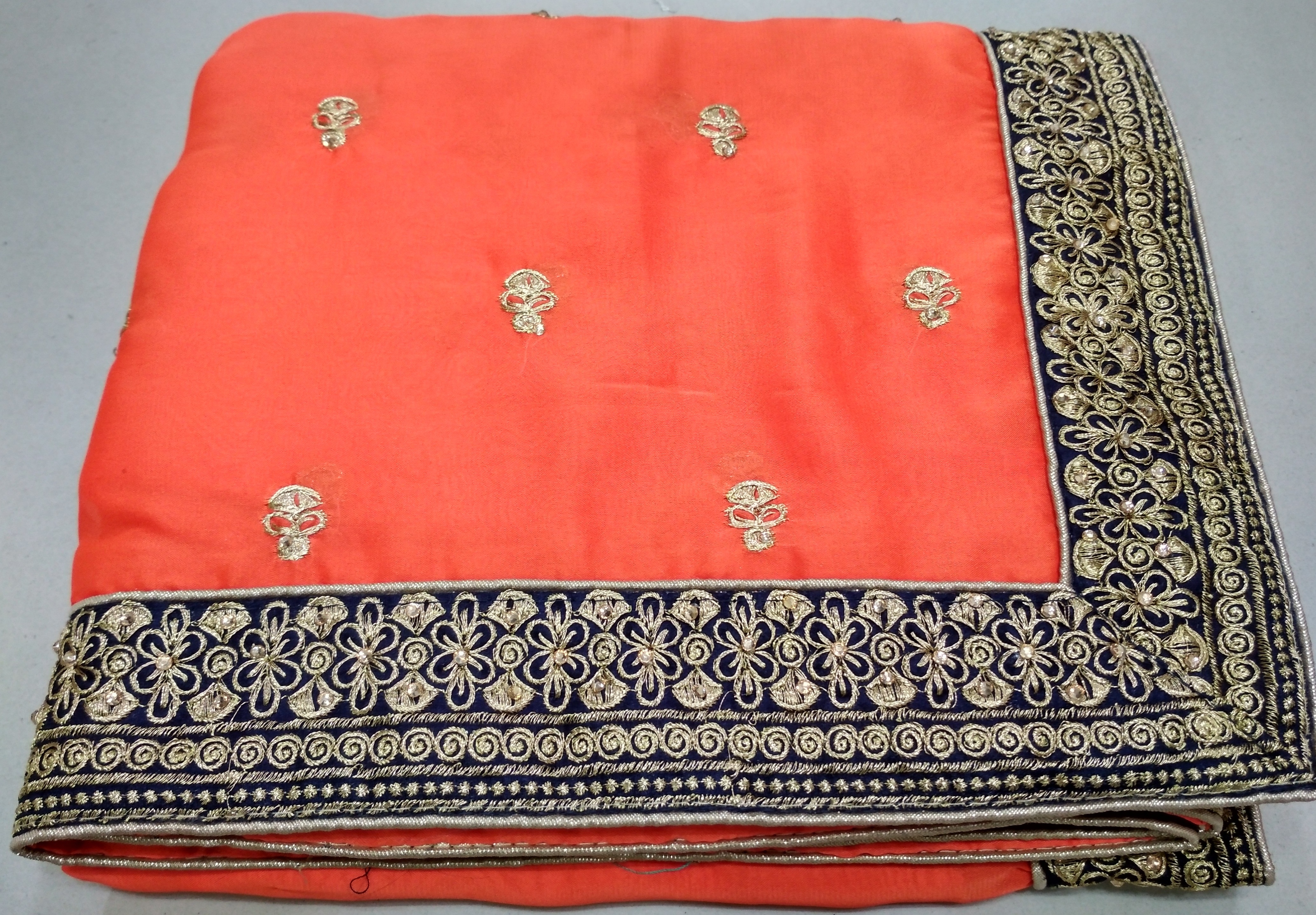 ऑरेंज ग्रीन रेड पिंक रंगोली जॉर्जेट एम्ब्रॉयडरी साड़ी