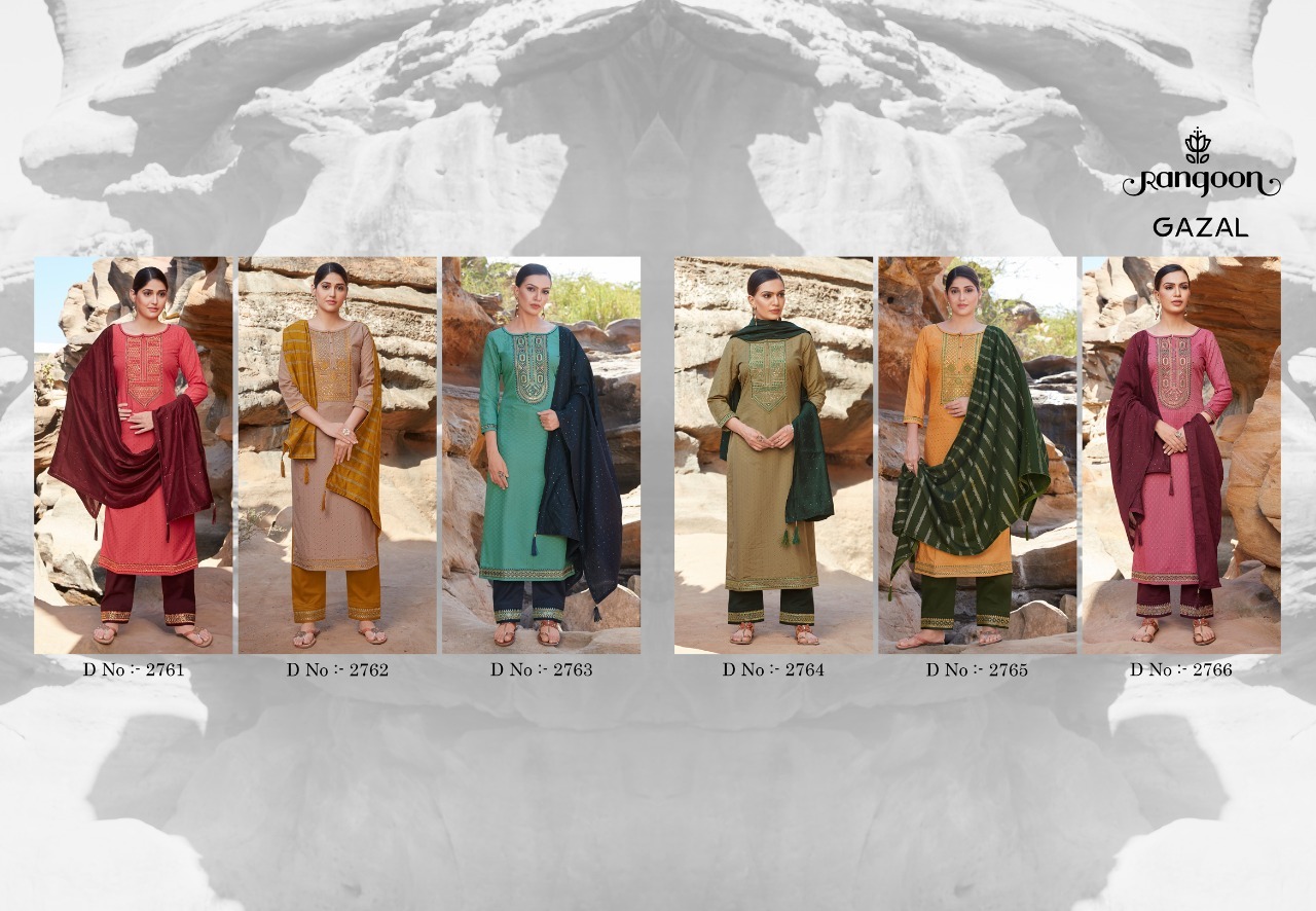 मल्टी कलर रंगून गज़ल सिल्क वीविंग बूटी और सिक्वेंस वर्क रेडीमेड सूट कैटलॉग