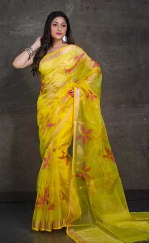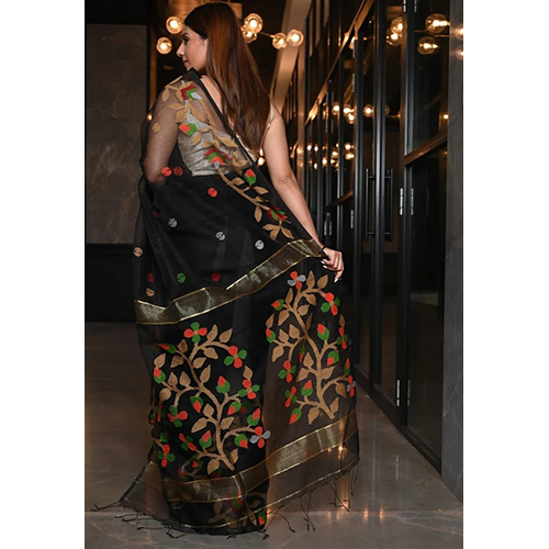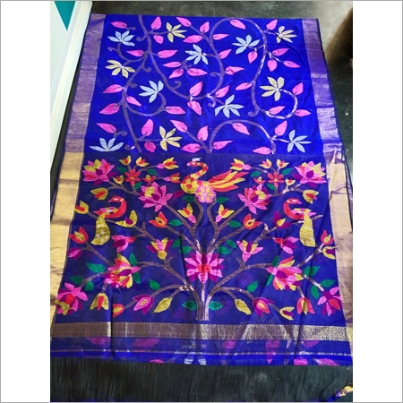 रसुम मोस्लिन जमदलनी साड़ी गोल्डन जरी स्काई ब्लू