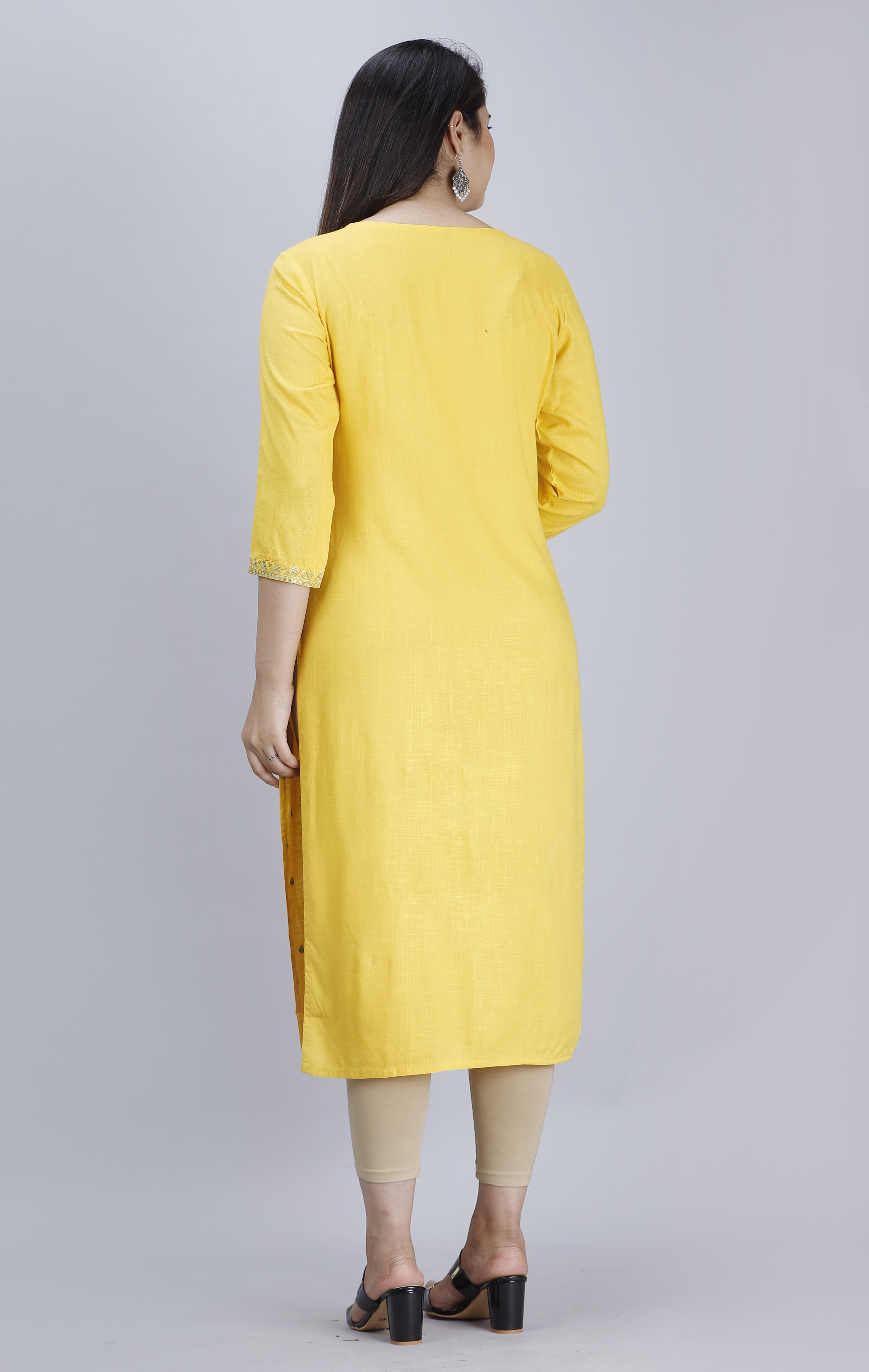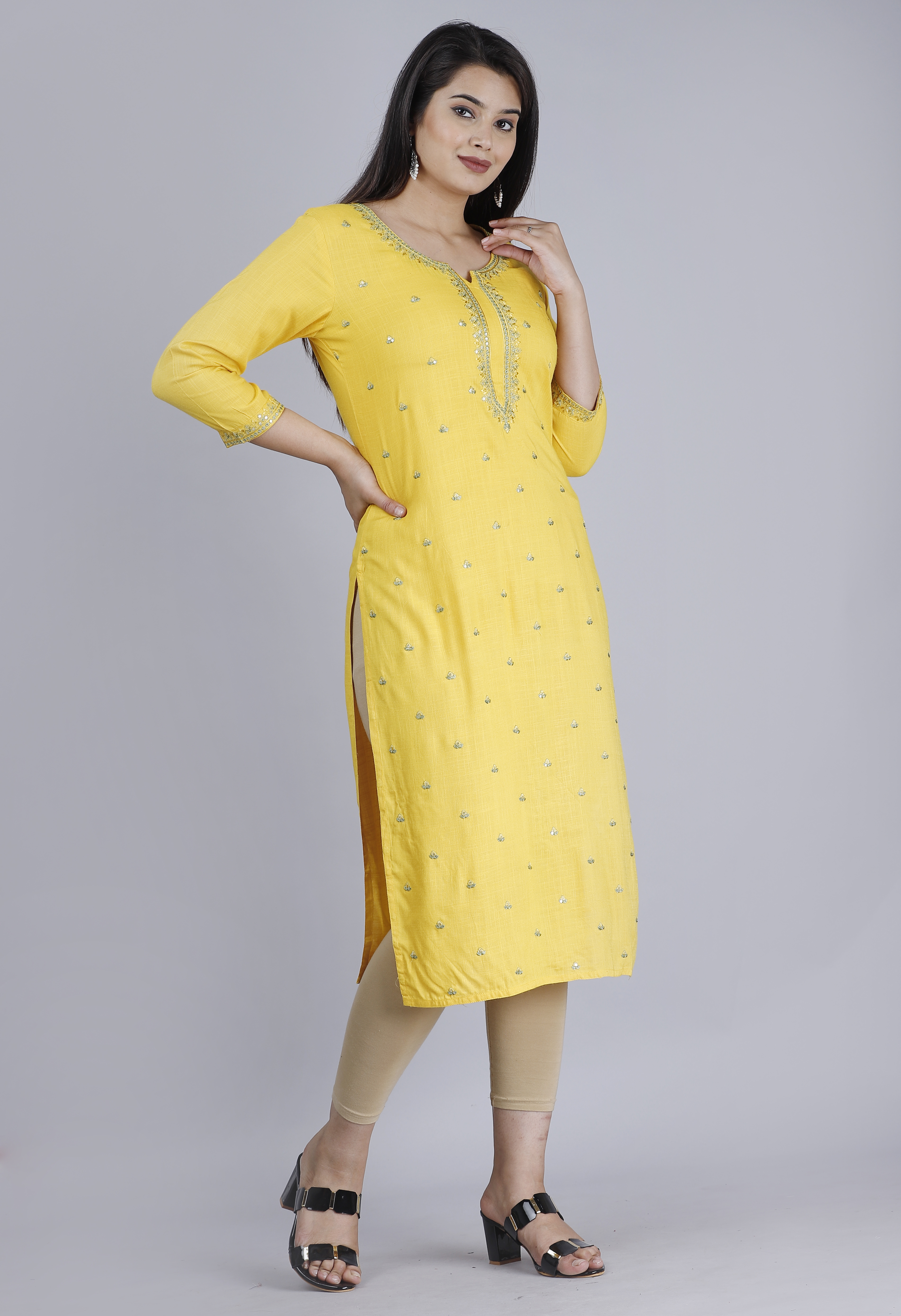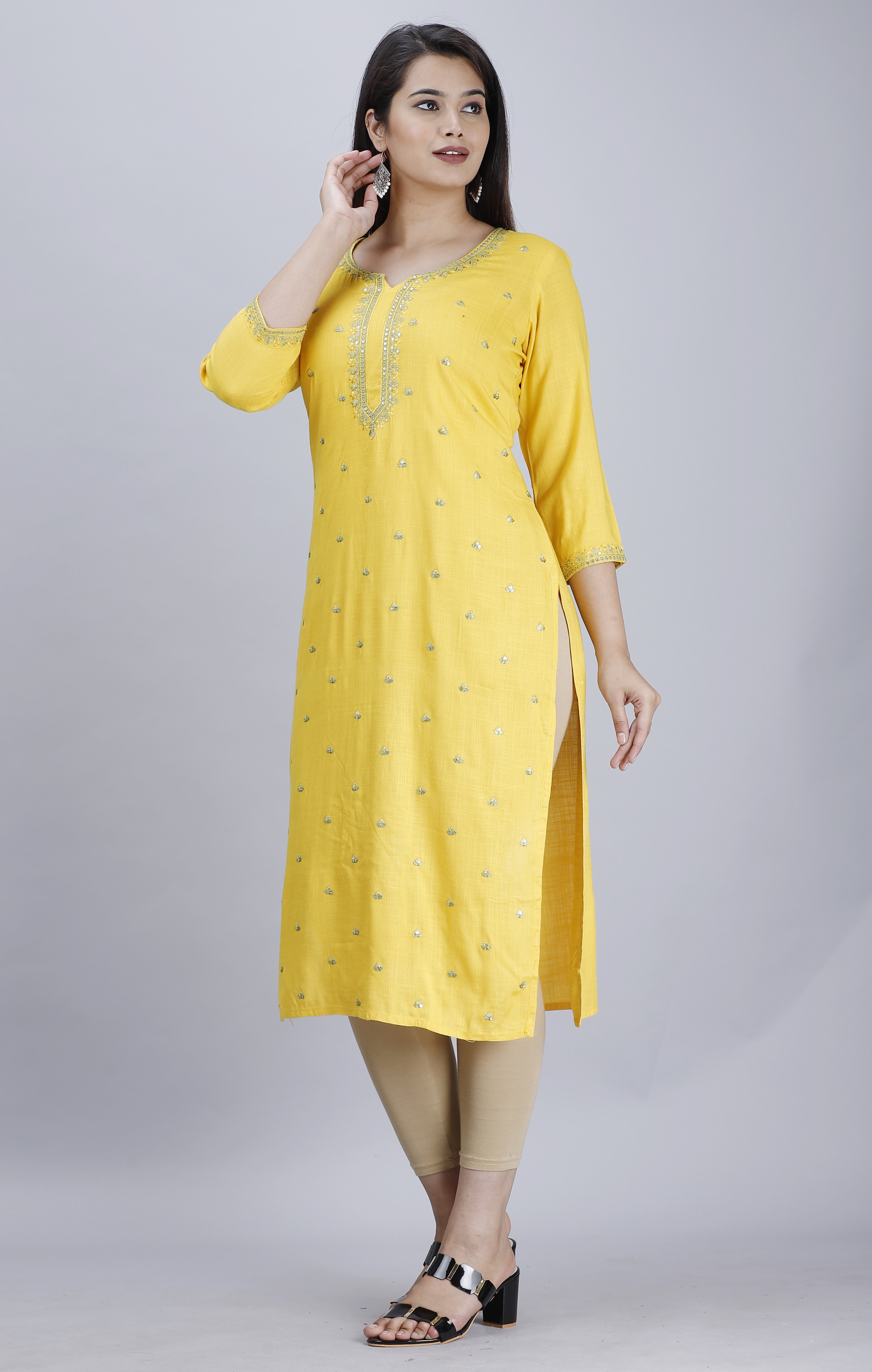 हवा पार होने योग्य रेयॉन स्लब मस्टर्ड एम्ब्रॉयडरी स्ट्रेट कुर्ती