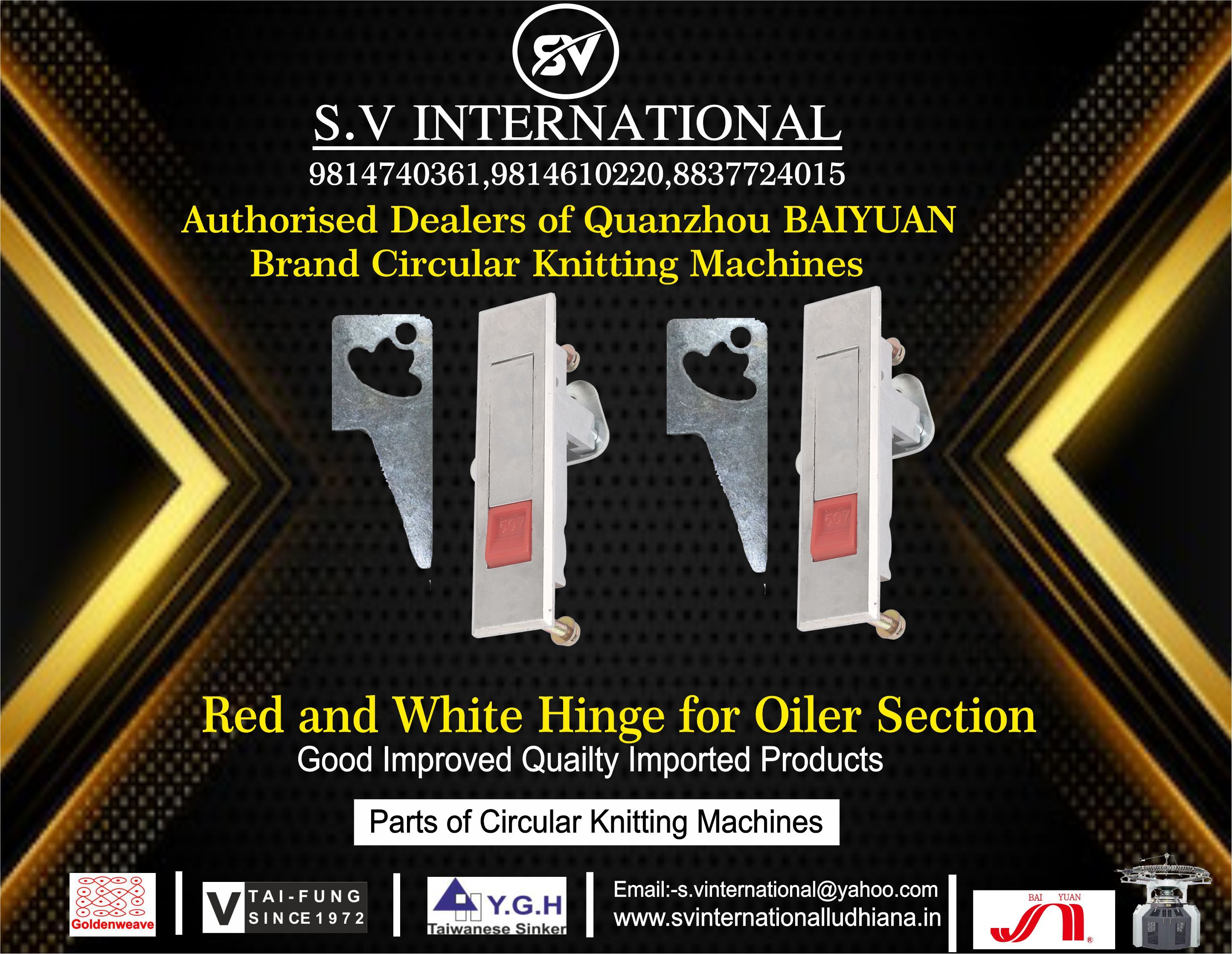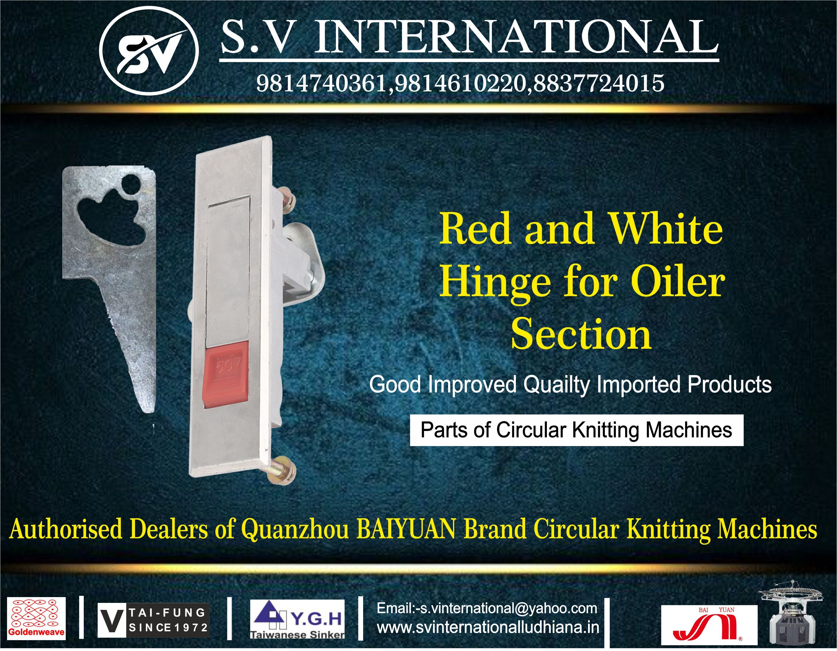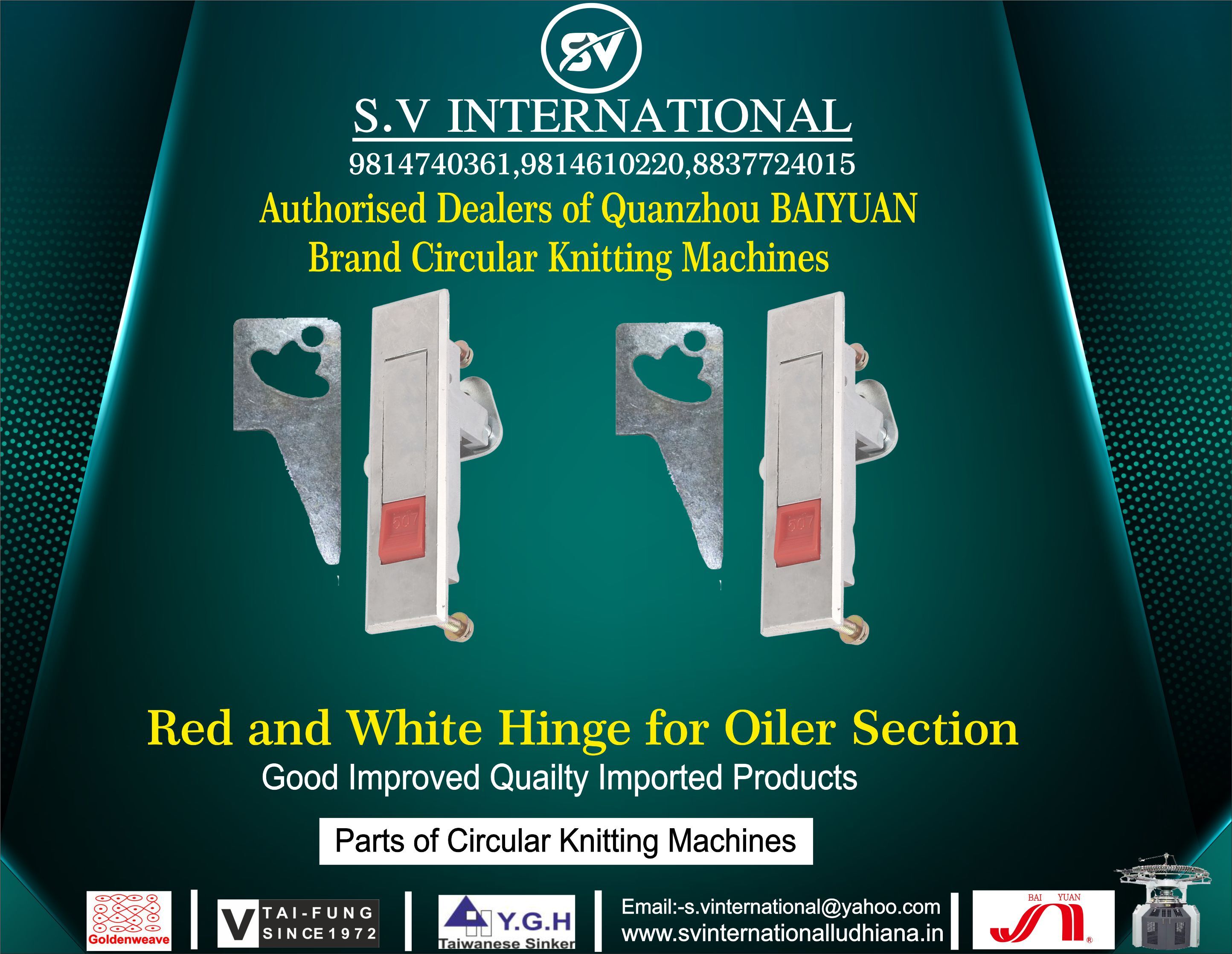 स.व् इंटरनेशनल, 2016 में पंजाब के लुधियाना में स्थापित, भारत में टेक्सटाइल मशीनरी के पुर्जे, अवयव और सहायक उपकरण का टॉप आयातक,आपूर्तिकर्ता,व्यापार कंपनी,थोक विक्रेता है। स.व् इंटरनेशनल ट्रेड इंडिया के सूचीबद्ध उत्पादों के सत्यापित और विश्वसनीय विक्रेताओं में से एक है। आपूर्ति और व्यापार के अपने व्यापक अनुभव के साथ, स.व् इंटरनेशनल ने उच्च गुणवत्ता आदि के साथ बाजार में अपने लिए एक प्रतिष्ठित नाम बनाया है। ग्राहक केंद्रित दृष्टिकोण पर ध्यान केंद्रित करते हुए, स.व् इंटरनेशनल की अखिल भारतीय उपस्थिति है और पूरे देश में एक विशाल उपभोक्ता आधार को पूरा करता है। स.व् इंटरनेशनल से ट्रेड इंडिया के गुणवत्ता-सुनिश्चित उत्पादों () को थोक में खरीदें।
