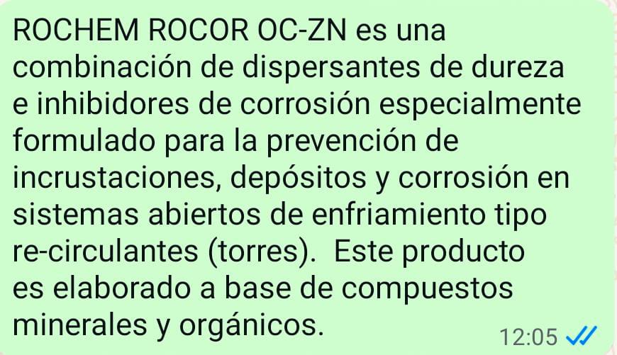 | प्रमाणपत्र | ROCHEM ROCOR OC-ZN es una combinaci n de dispersantes de dureza e inhibidores de corrosi n especialmente formulado para la prevenci n de incrustaciones, dep sitos y corrosi n en sistemas abiertos de enfriamiento tipo re-circulantes (torres). Este producto es elaborado a base de compuestos minerales y org nicos. |