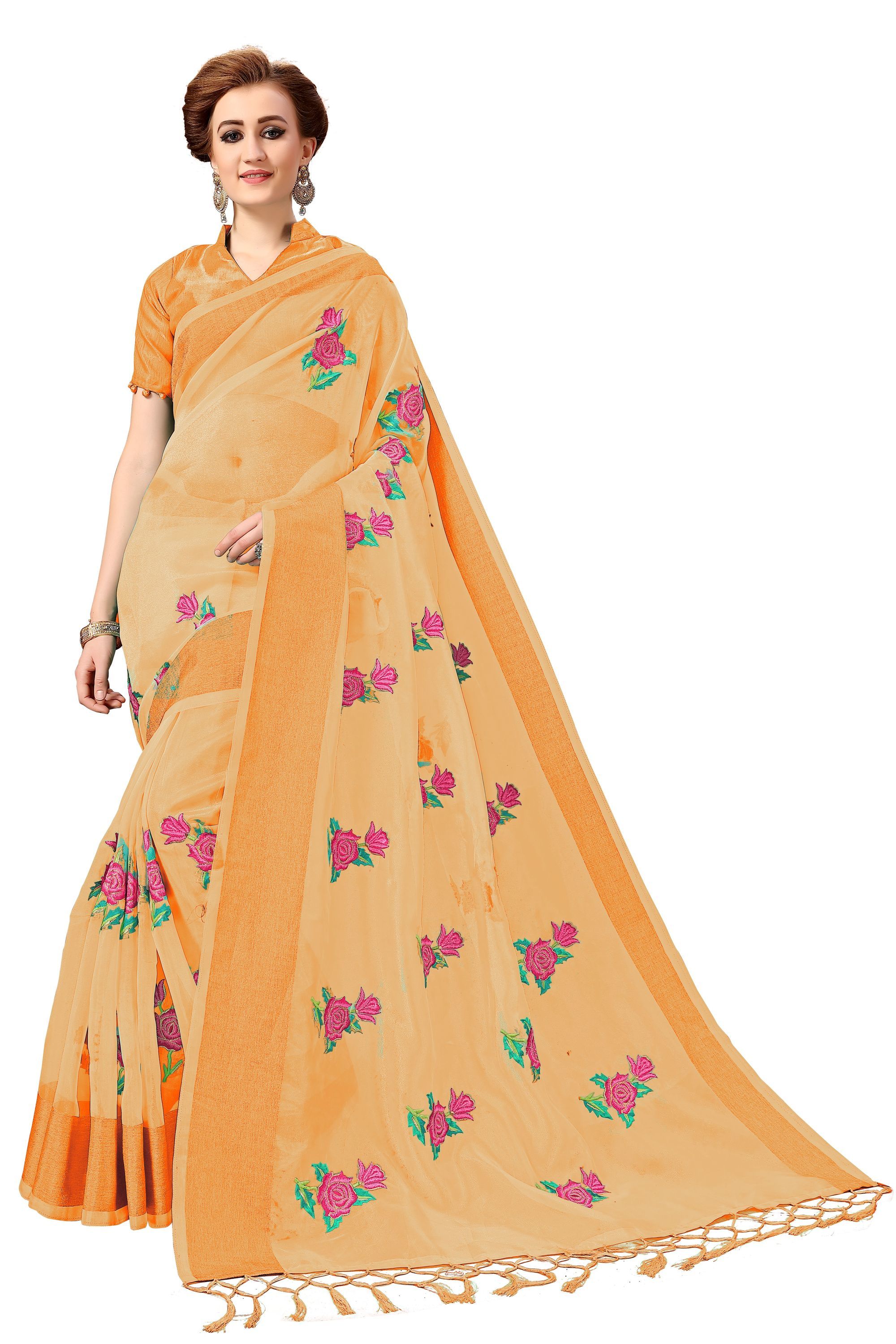 पिंक (गुलाबी) महिलाओं के लिए कॉटन ब्लेंड बेज प्रिंटेड साड़ी ब्लाउज पीस के साथ