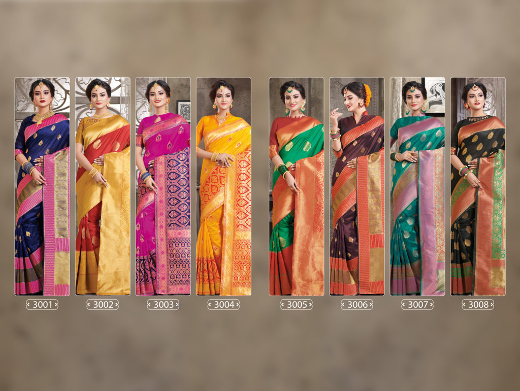 मल्टी कलर संगम प्रिंट्स संस्कृत क्रिस्टल सिल्क डिज़ाइनर साड़ी कैटलॉग