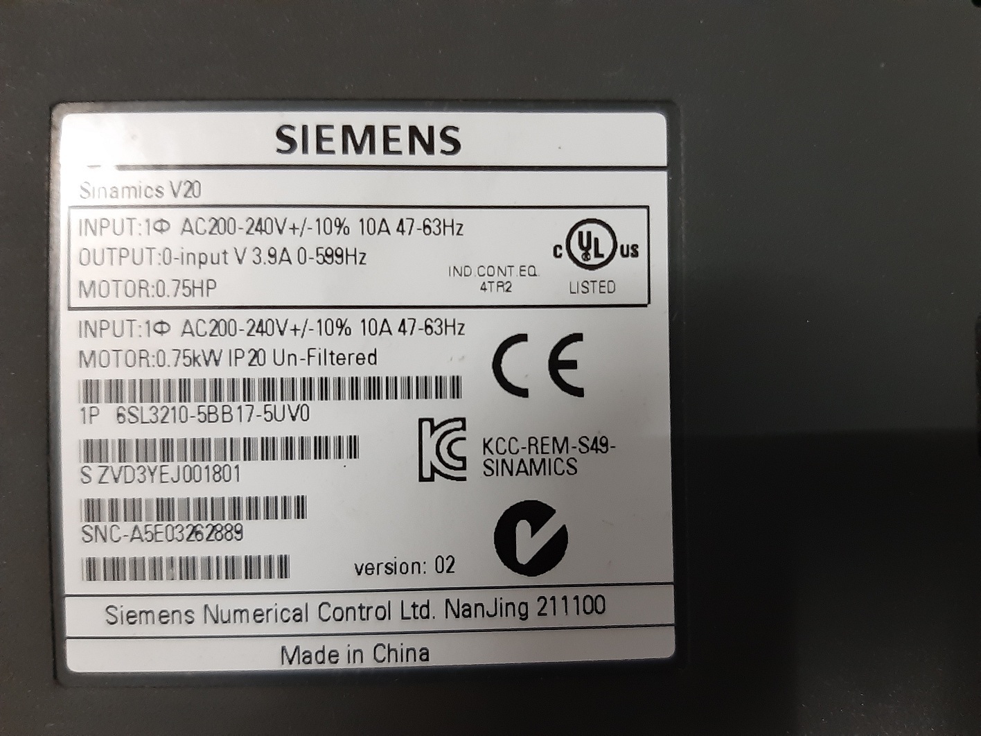 सीमेंस सिनामिक्स V20 इन्वर्टर ड्राइव 1p 6sl3210-5bb17-5uv0