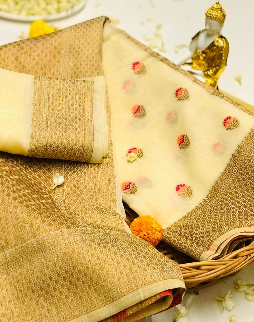 क्रीम रंग की महिलाओं की क्रश चिनोन साड़ी ब्लाउज़ और कमर बेल्ट के साथ