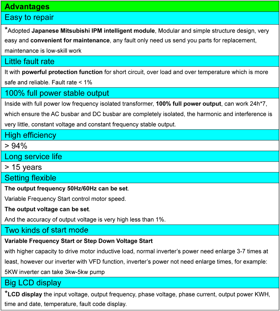 | वोल्टेज सुरक्षा | Input under voltage, over voltage, output over-current, short circuit, overheating etc. |