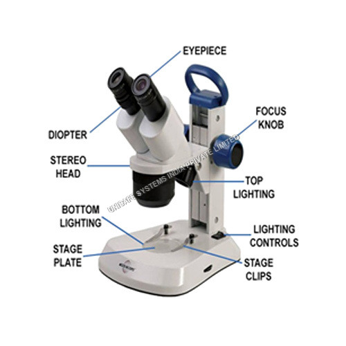| विशेषताएँ | Includes eyepiece stereo head focus knob top lighting bottom lighting stage plate stage clips and lighting controls. |