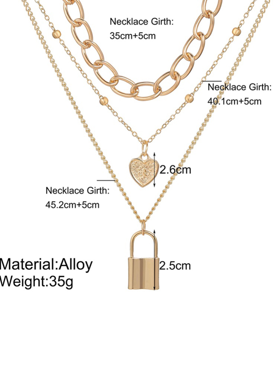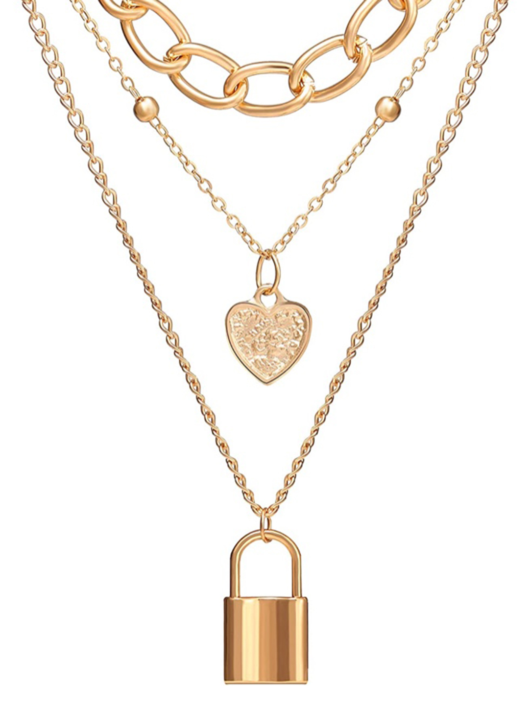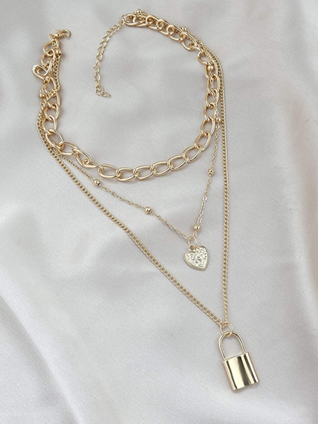 Explore in english - Gold Plated Triple Layered Chunky Chain Heart and Lock Pendant Necklace