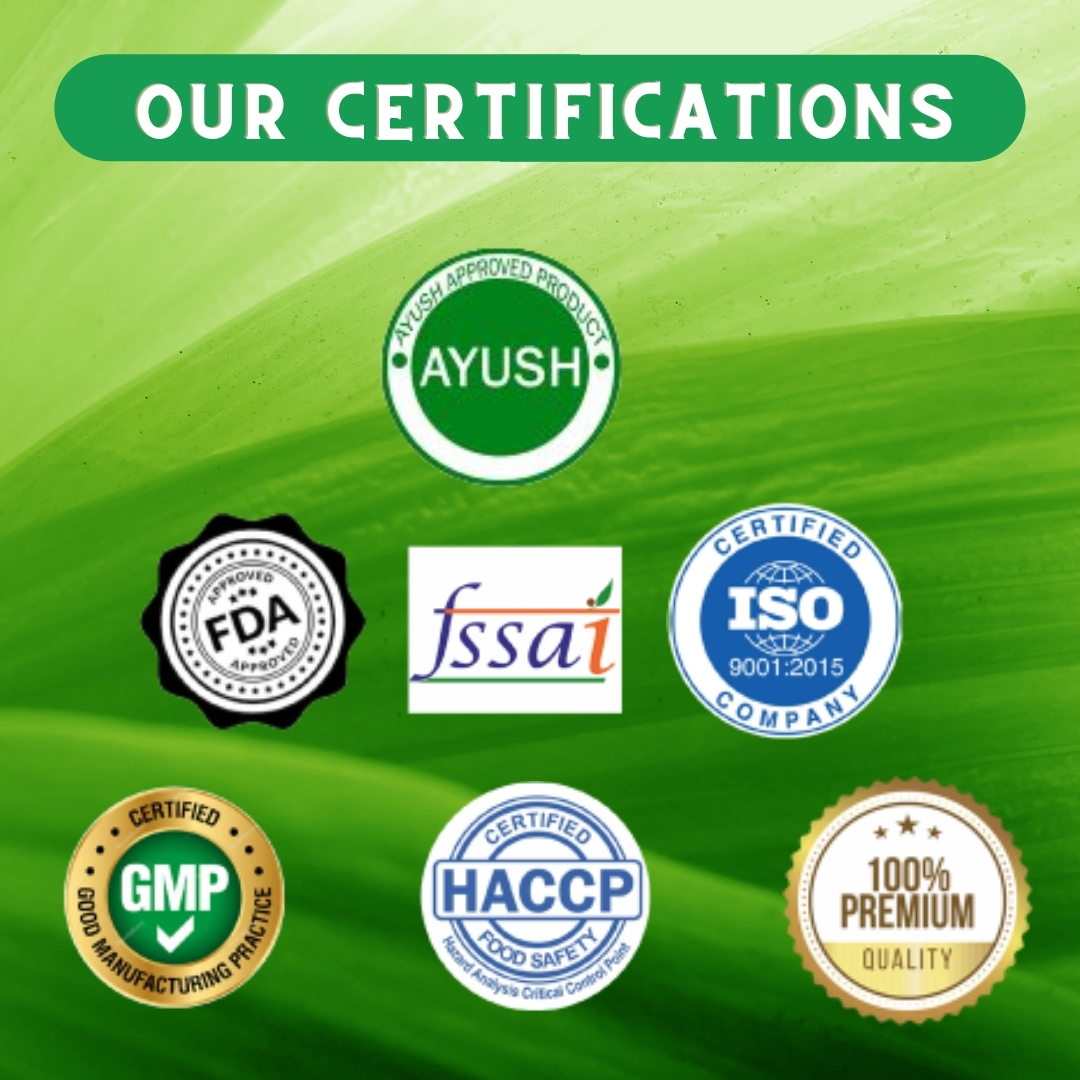 | प्रमाणपत्र | AYUSH , FSSAI, ISO, GMP , HACCP |