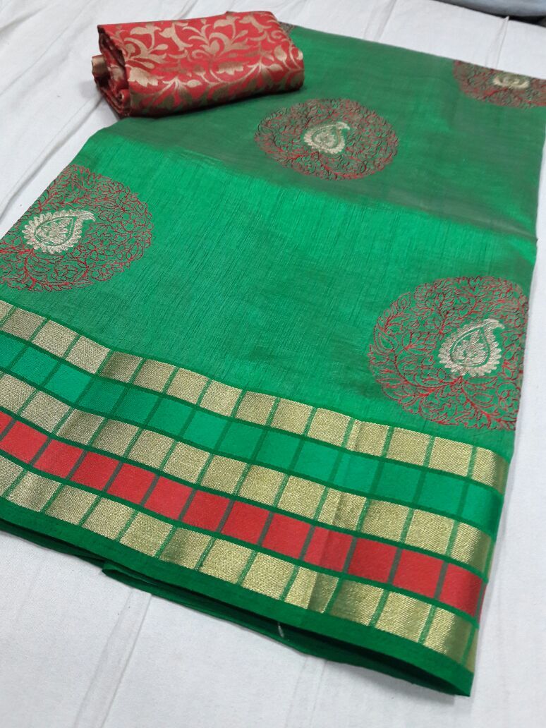 समर ग्रीन और ब्राउन पार्टी वियर ब्लाउज पीस के साथ स्किन फ्रेंडली लेडीज़ टिश्यू सिल्क प्लेन साड़ी