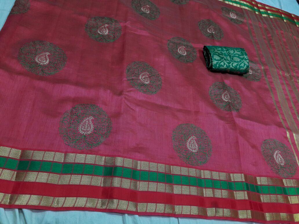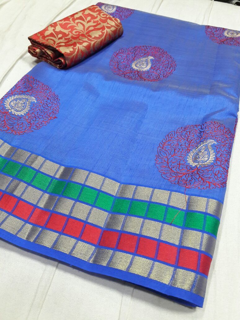 शिफॉन टसर सिल्क गोल डिज़ाइन वाली एम्ब्रॉडरी साड़ी एक्स्ट्रा जैक्वार्ड ब्लाउज के साथ