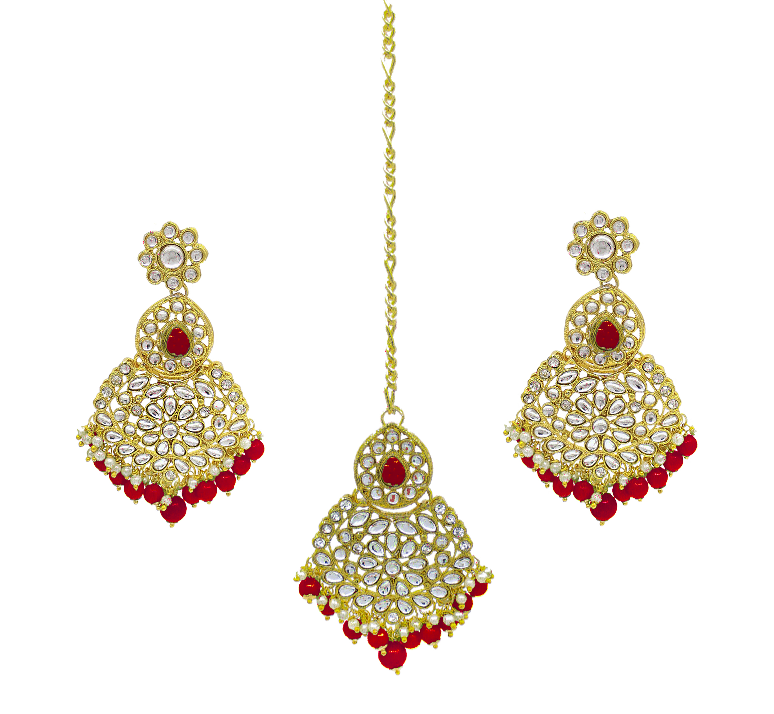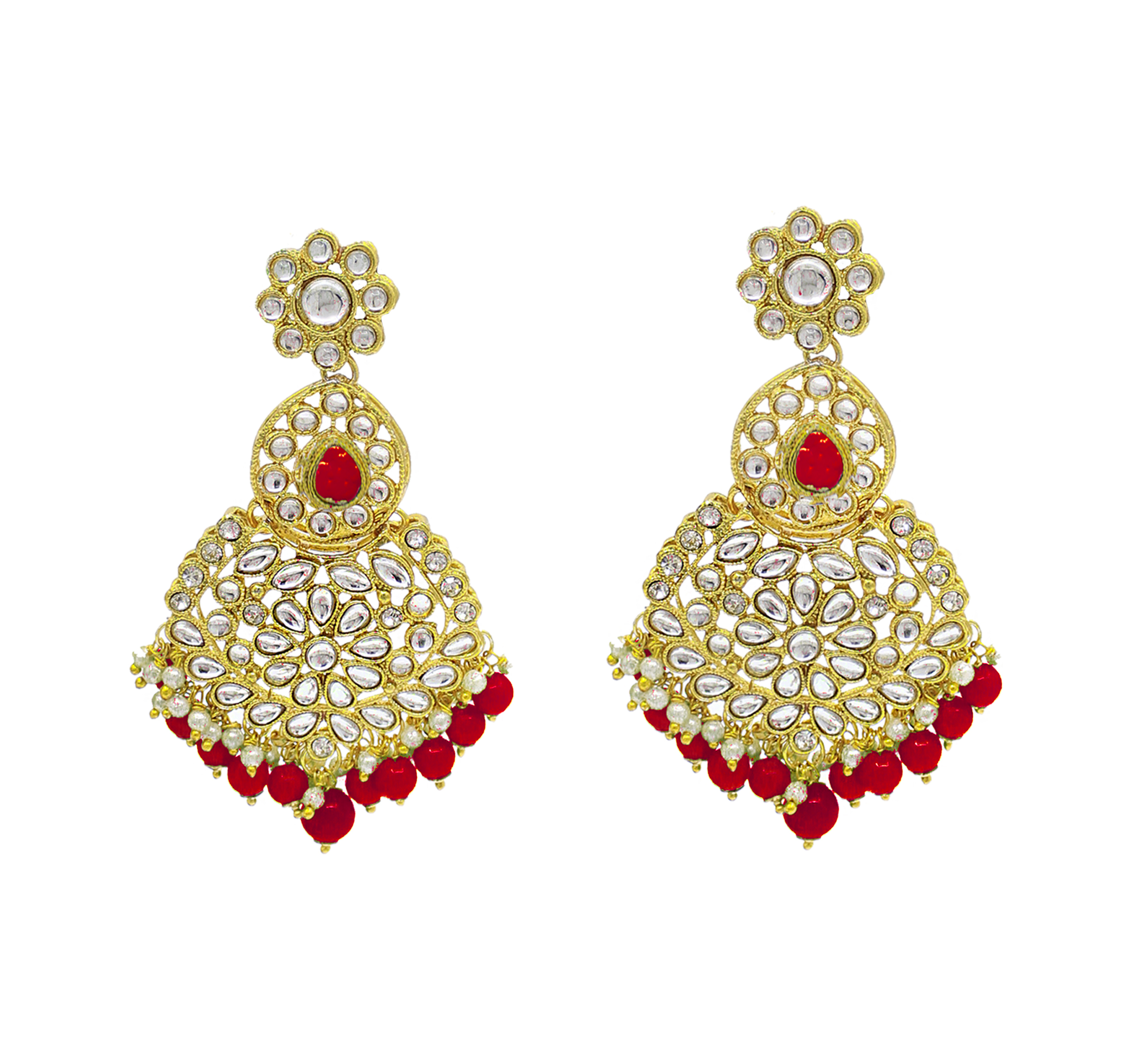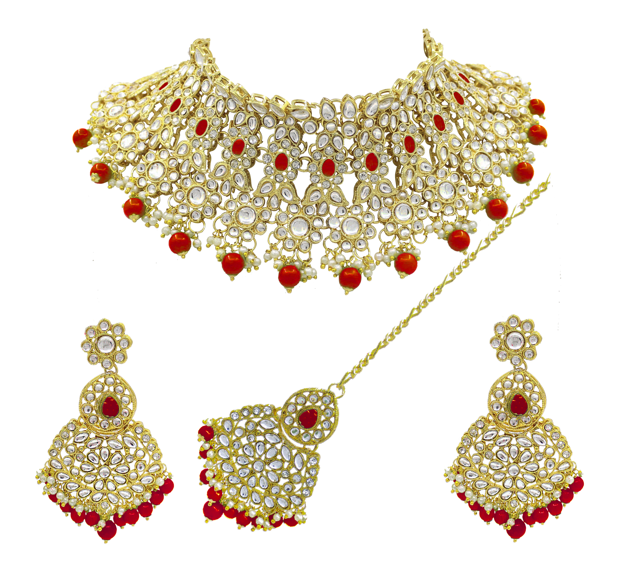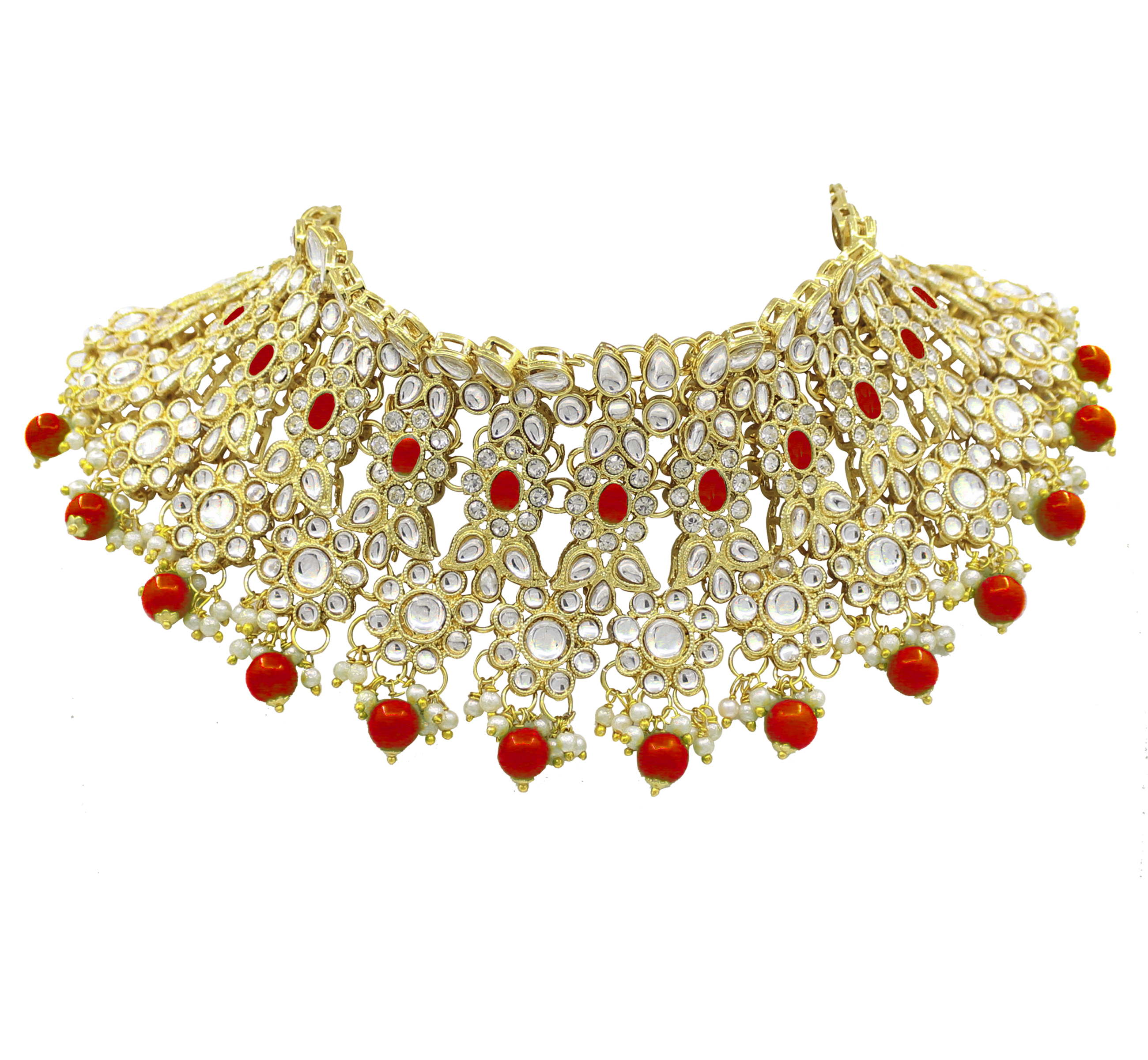 वेडिंग कलेक्शन कुंदन स्टोन वर्क गोल्ड प्लेटेड रेड कलर चोकर नेकलेस सेट ड्रॉप इयररिंग्स