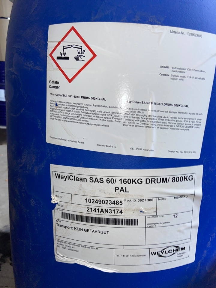 | पैकेजिंग का विवरण | WeylClean® SAS 60 is available in the following standard package size: 160 kg HDPE lidded drum (CP-1 pallet with 800 kg) 1000 kg IBC |